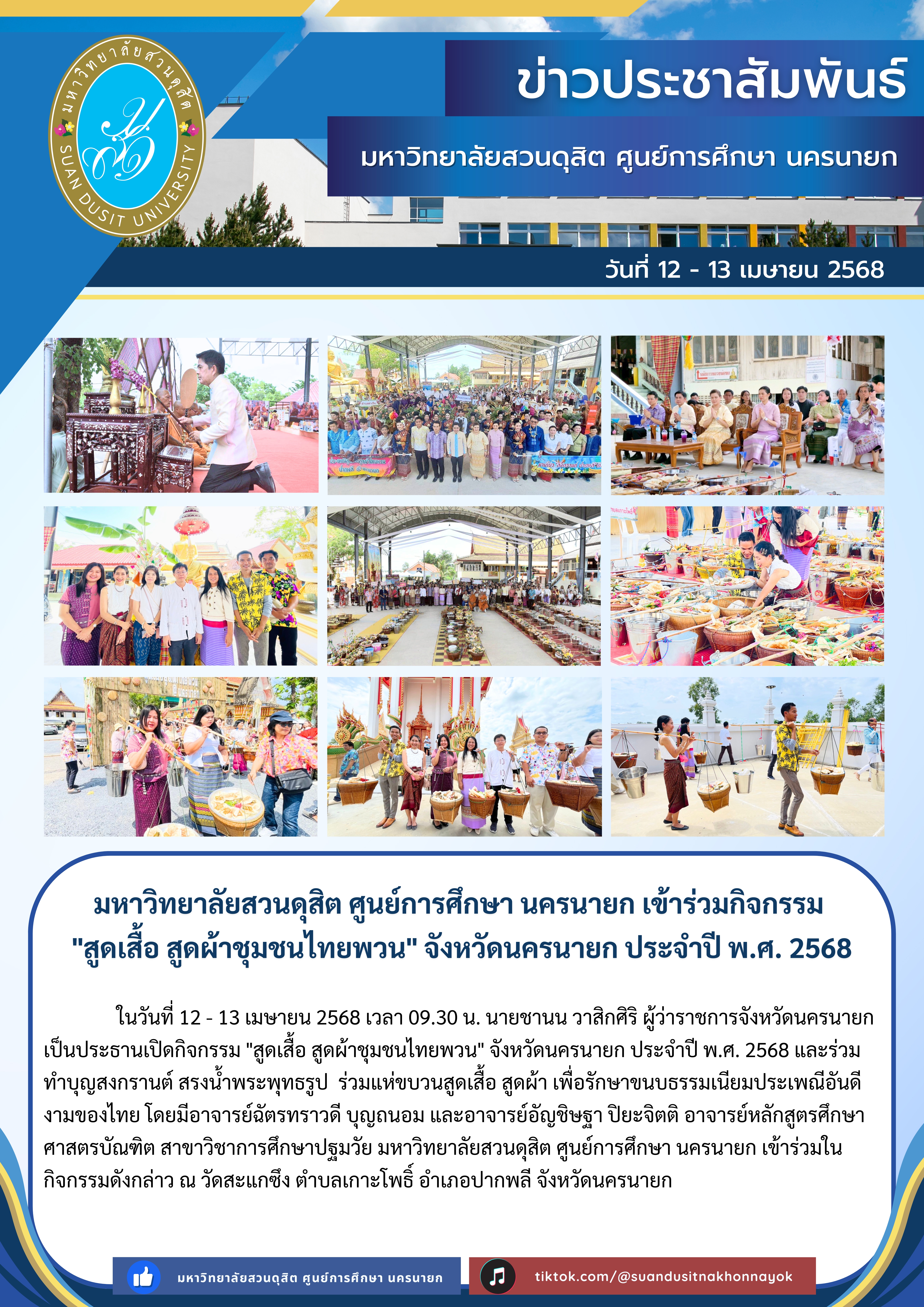 Item มหาวิทยาลัยสวนดุสิต ศูนย์การศึกษา นครนายก เข้าร่วมพิธีลงนามบันทึกข้อตกลงความร่วมมือ (MOU) เดินหน้าขับเคลื่อนแผนพัฒนาเด็กปฐมวัย ระยะ 3 ปี (พ.ศ. 2568 - 2570) จังหวัดนครนายก(มหาวิทยาลัยสวนดุสิต ศูนย์การศึกษา นครนายก, 2025-08-08) มหาวิทยาลัยสวนดุสิต ศูนย์การศึกษา นครนายก; ฉัตรชัย ต้นมงคลวัฒนาItem มหาวิทยาลัยสวนดุสิต ศูนย์การศึกษา นครนายก ต้อนรับคณะศึกษาดูงาน สังกัดกองกลาง สำนักงานอธิการบดี มหาวิทยาลัยราชภัฏชัยภูมิ(มหาวิทยาลัยสวนดุสิต ศูนย์การศึกษา นครนายก, 2025-07-31) มหาวิทยาลัยสวนดุสิต ศูนย์การศึกษา นครนายก; ฉัตรชัย ต้นมงคลวัฒนาItem มหาวิทยาลัยสวนดุสิต ศูนย์การศึกษา นครนายก หลักสูตรศึกษาศาสตรบัณฑิต สาขาวิชาการศึกษาปฐมวัย รับการตรวจประกันคุณภาพการศึกษาภายใน ระดับหลักสูตร ประจำปีการศึกษา 2567(มหาวิทยาลัยสวนดุสิต ศูนย์การศึกษา นครนายก, 2025-07-26) มหาวิทยาลัยสวนดุสิต ศูนย์การศึกษา นครนายก; ฉัตรชัย ต้นมงคลวัฒนาItem มหาวิทยาลัยสวนดุสิต ศูนย์การศึกษา นครนายก จัดการประชุมบุคลากรประจำเดือนมิถุนายน - กรกฎาคม 2568(มหาวิทยาลัยสวนดุสิต ศูนย์การศึกษา นครนายก, 2025-07-25) มหาวิทยาลัยสวนดุสิต ศูนย์การศึกษา นครนายก; ฉัตรชัย ต้นมงคลวัฒนาItem มหาวิทยาลัยสวนดุสิต ศูนย์การศึกษา นครนายก จัดโครงการพัฒนาสมรรถนะนักศึกษาสาขาวิชาการศึกษาปฐมวัยสู่ความเป็นเลิศ ในศตวรรษที่ 21 กิจกรรมที่ 3 English Life & Skills Orientation: Explain activities and schedules, design and plan group activities together ครั้งที่ 2(มหาวิทยาลัยสวนดุสิต ศูนย์การศึกษา นครนายก, 2025-07-25) มหาวิทยาลัยสวนดุสิต ศูนย์การศึกษา นครนายก; ฉัตรชัย ต้นมงคลวัฒนาItem มหาวิทยาลัยสวนดุสิต ศูนย์การศึกษา นครนายก หลักสูตรศึกษาศาสตรบัณฑิต สาขาวิชาการประถมศึกษา รับการตรวจประกันคุณภาพการศึกษาภายใน ระดับหลักสูตร ประจำปีการศึกษา 2567(มหาวิทยาลัยสวนดุสิต ศูนย์การศึกษา นครนายก, 2025-07-25) มหาวิทยาลัยสวนดุสิต ศูนย์การศึกษา นครนายก; ฉัตรชัย ต้นมงคลวัฒนาItem ศูนย์การเรียนรู้เกษตรปลอดภัยและนันทนาการ จังหวัดปราจีนบุรี ร่วมกิจกรรมออกบูธ งานโครงการคลินิคเกษตรเคลื่อนที่ในพระราชานุเคราะห์ ฯ สมเด็จพระบรมโอรสาธิราช ฯ สยามมกุฎราชกุมาร ประจำไตรมาสที่ 4(มหาวิทยาลัยสวนดุสิต ศูนย์การศึกษา นครนายก, 2025-07-24) มหาวิทยาลัยสวนดุสิต ศูนย์การศึกษา นครนายก; ฉัตรชัย ต้นมงคลวัฒนาItem มหาวิทยาลัยสวนดุสิต ศูนย์การศึกษา นครนายก ร่วมพิธีถวายพระพรชัยมงคล พระบาทสมเด็จพระปรเมนทรรามาธิบดีศรีสินทรมหาวชิราลงกรณฯ พระวชิรเกล้าเจ้าอยู่หัว เนื่องในโอกาสมหามงคลทรงเจริญพระชนมพรรษา 73 พรรษา(มหาวิทยาลัยสวนดุสิต ศูนย์การศึกษา นครนายก, 2025-07-24) มหาวิทยาลัยสวนด