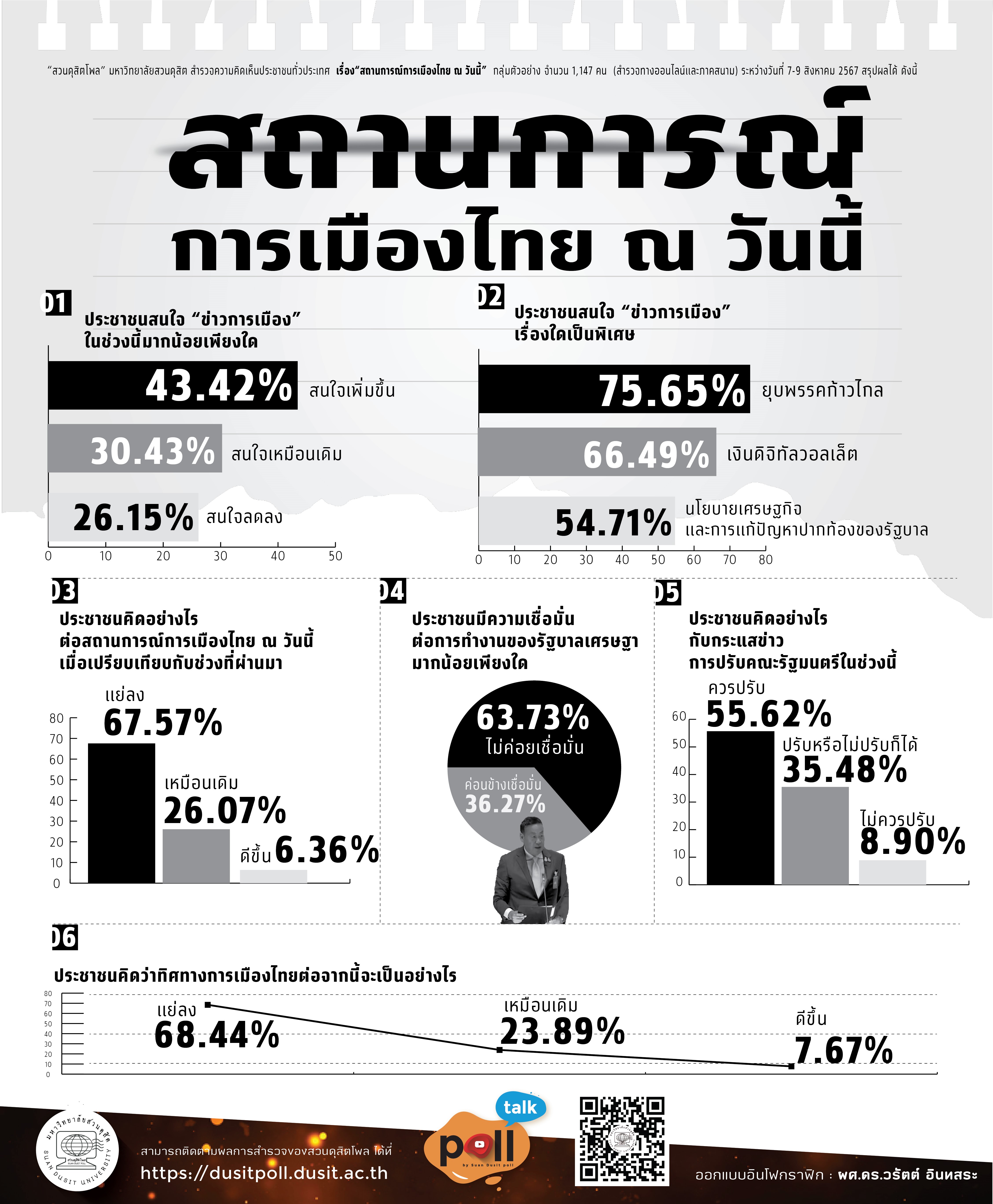 สวนดุสิตโพล มหาวิทยาลัยสวนดุสิต สำรวจความคิดเห็นประชาชนทั่วประเทศ เรื่อง “สถานการณ์การเมืองไทย ณ วันนี้” ระหว่างวันที่ 7-9 สิงหาคม 2567 กลุ่มตัวอย่างจำนวน 1,147 คน สำรวจผ่านทางออนไลน์และภาคสนาม พบว่า กลุ่มตัวอย่างสนใจข่าวการเมืองในช่วงนี้เพิ่มขึ้น ร้อยละ 43.42 โดยสนใจข่าวยุบพรรคก้าวไกลเป็นพิเศษ ร้อยละ 75.65 เมื่อเปรียบเทียบสถานการณ์การเมือง ณ วันนี้กับช่วงที่ผ่านมา คิดว่าแย่ลง ร้อยละ 67.57 ด้านความเชื่อมั่นต่อรัฐบาลเศรษฐา กลุ่มตัวอย่างรู้สึกไม่ค่อยเชื่อมั่น ร้อยละ 63.73 ด้านกระแสข่าวการปรับคณะรัฐมนตรีก็เห็นว่าควรปรับ ร้อยละ 55.62 สุดท้ายมองว่าทิศทางการเมืองไทยต่อจากนี้น่าจะแย่ลง ร้อยละ 68.44