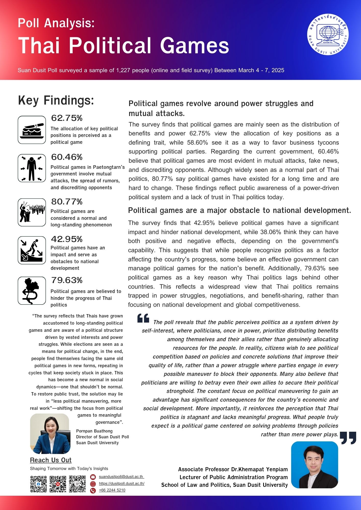 บทวิเคราะห์ผลโพล: เกมการเมืองไทย ณ วันนี้ สวนดุสิตโพล สำรวจความคิดเห็นจากประชาชน 1,227 คน (สำรวจทางออนไลน์และภาคสนาม) ระหว่างวันที่ 4-7 มีนาคม 2568 --- ข้อค้นพบที่สำคัญ: 62.75% มองว่าการแย่งตำแหน่งและอำนาจเป็นลักษณะของเกมการเมือง 60.46% เกมการเมืองใช้รัฐบาลแพะบูชายัญ คือ การโบ้ยตีที่ไป ปล่อยข่าวดิสเครดิต 80.77% มองว่าเกมการเมืองเป็นเรื่องผลประโยชน์ส่วนตน 42.95% เกมการเมืองส่งผลกระทบเป็นลบต่อการพัฒนาประเทศ 79.63% เห็นด้วยว่าการเมืองทำให้การเมืองไทยล้าหลัง ความคิดเห็นจากผู้เชี่ยวชาญ: "ผลโพลสะท้อนให้เห็นว่าคนไทยปัจจุบันมองว่าเกมการเมืองมีลักษณะที่มุ่งหวังผลประโยชน์ส่วนตนมากกว่าประโยชน์ของประเทศ และยังเป็นอุปสรรคต่อการพัฒนาประเทศอย่างมีประสิทธิภาพ โดยเฉพาะการใช้กลยุทธ์ดิสเครดิตโจมตีคู่แข่งที่ทำให้ความเชื่อมั่นต่อการเมืองลดลง" — นางสาวพรพรรณ บัวทอง ประธานสวนดุสิตโพล "จากผลโพลชี้ชัดว่าการเมืองเป็นเรื่องของผลประโยชน์ที่กีดกันความเจริญของประเทศ จำเป็นต้องสร้างความเชื่อมั่นและความโปร่งใสให้มากขึ้น เพื่อดึงศรัทธาของประชาชนกลับคืนมา เกมการเมืองที่ยึดผลประโยชน์ส่วนตนจะเป็นโซ่ตรวนที่ฉุดรั้งประเทศจากการพัฒนา หากไม่แก้ไขปัญหาอย่างจริงจัง เราจะไม่มีวันที่เห็นการเมืองไทยที่ทำเพื่อประเทศชาติอย่างแท้จริง" — รองศาสตราจารย์ ดร.เขมภัทท์ เย็นเปี่ยม หลักสูตรรัฐศาสตร์การเมืองการปกครอง โรงเรียนกฎหมายและการเมือง มหาวิทยาลัยสวนดุสิต