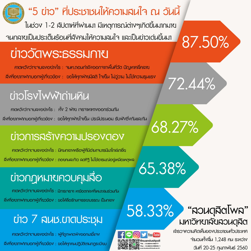 “สวนดุสิตโพล” ได้สำรวจความคิดเห็นของประชาชนทั่วประเทศ จำนวน 1,248 คน ระหว่างวันที่ 20–25 กุมภาพันธ์ 2560 เพื่อจัดอันดับข่าวที่ได้รับความสนใจมากที่สุด ณ ขณะนั้น ผลสำรวจพบว่า “ข่าววัดพระธรรมกาย” ได้รับความสนใจมากที่สุด (87.50%) เนื่องจากเป็นเหตุการณ์ที่ส่งผลกระทบกว้างขวางในระดับชาติ รองลงมาคือ “ข่าวโรงไฟฟ้าถ่านหิน” (72.44%) ซึ่งเชื่อมโยงกับประเด็นด้านสิ่งแวดล้อมและสุขภาพของประชาชน, “ข่าวการสร้างความปรองดอง” (68.27%), “ข่าวกฎหมายควบคุมสื่อ” (65.38%) และ “ข่าว สนช. ขาดประชุม” (58.33%) ข้อเสนอของประชาชนในแต่ละกรณีสะท้อนความต้องการให้ทุกฝ่ายใช้สติและความยุติธรรมในการดำเนินการ เช่น การไม่ใช้ความรุนแรง, เจรจาหาทางออกร่วมกัน, ให้สื่อมวลชนมีเสรีภาพบนพื้นฐานของจรรยาบรรณ และการเน้นธรรมาภิบาลในการทำงานของเจ้าหน้าที่รัฐ