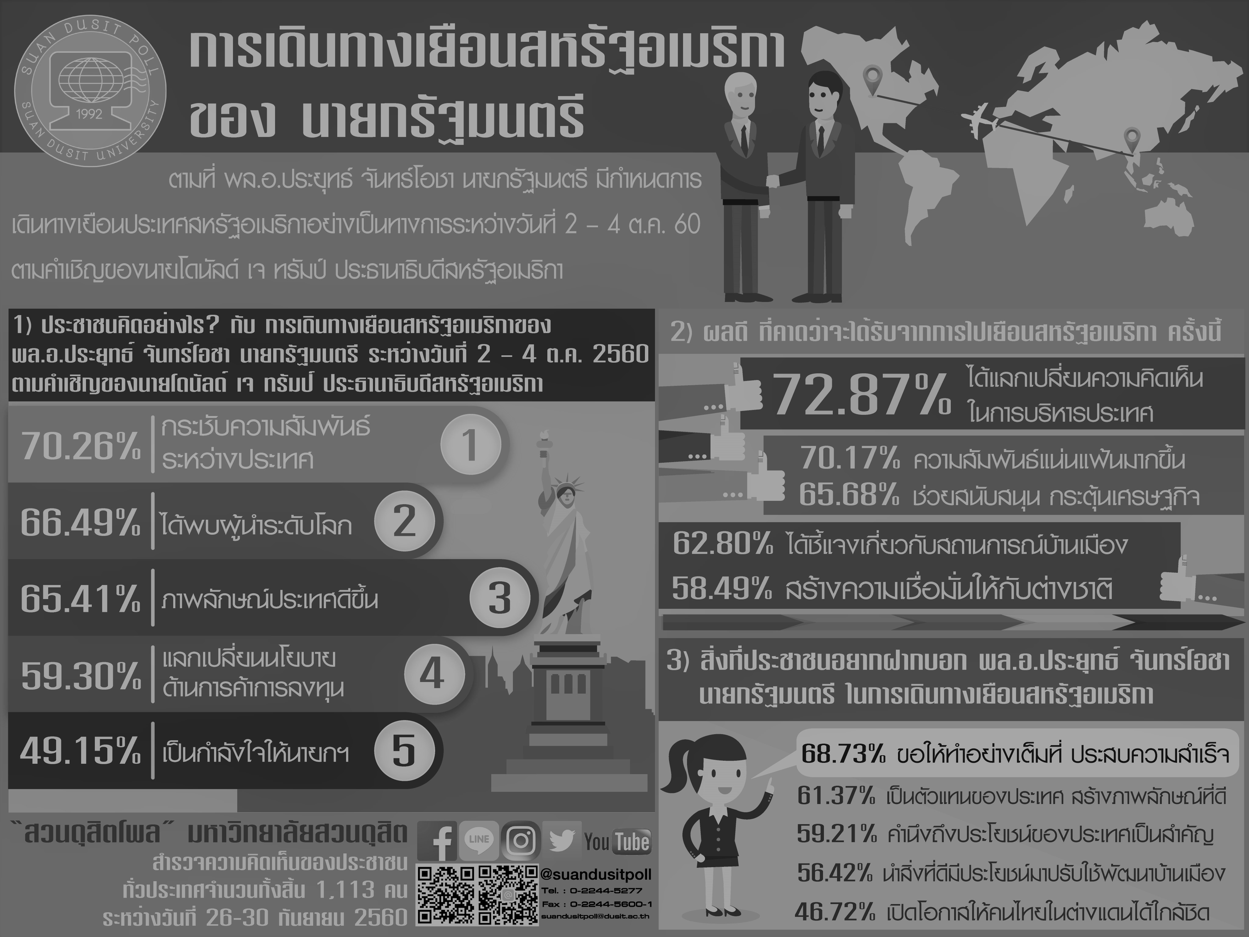 จากการสำรวจความคิดเห็นของประชาชนทั่วประเทศ จำนวน 1,113 คน ระหว่างวันที่ 26–30 กันยายน 2560 เกี่ยวกับการเดินทางเยือนสหรัฐอเมริกาของพลเอกประยุทธ์ จันทร์โอชา นายกรัฐมนตรี พบว่า 70.26% ของประชาชนเชื่อว่าการเยือนครั้งนี้จะช่วยกระชับความสัมพันธ์ระหว่างประเทศ และ 66.49% มองว่าช่วยยกระดับภาพลักษณ์ไทยในระดับโลก นอกจากนี้ 72.87% เห็นว่าเป็นโอกาสแลกเปลี่ยนความคิดเห็นด้านการบริหารประเทศ และ 70.17% เชื่อว่าจะเสริมความมั่นคงและความสัมพันธ์เชิงเศรษฐกิจ ประชาชนยังแสดงความคาดหวังให้รัฐบาลผลักดันผลประโยชน์อย่างเต็มที่ โดย 68.73% ขอให้ดำเนินการต่าง ๆ อย่างเร่งด่วนและโปร่งใส โดยเฉพาะในด้านเศรษฐกิจ การค้า และการลงทุน เพื่อผลประโยชน์ของประเทศชาติ ขณะเดียวกัน 62.80% ต้องการเห็นท่าทีต่อสถานการณ์ในประเทศที่ชัดเจนขึ้นจากเวทีระหว่างประเทศ สะท้อนถึงความคาดหวังของประชาชนที่อยากให้รัฐบาลสร้างภาพลักษณ์ที่ดีและผลักดันความร่วมมือระหว่างประเทศอย่างมีประสิทธิภาพ