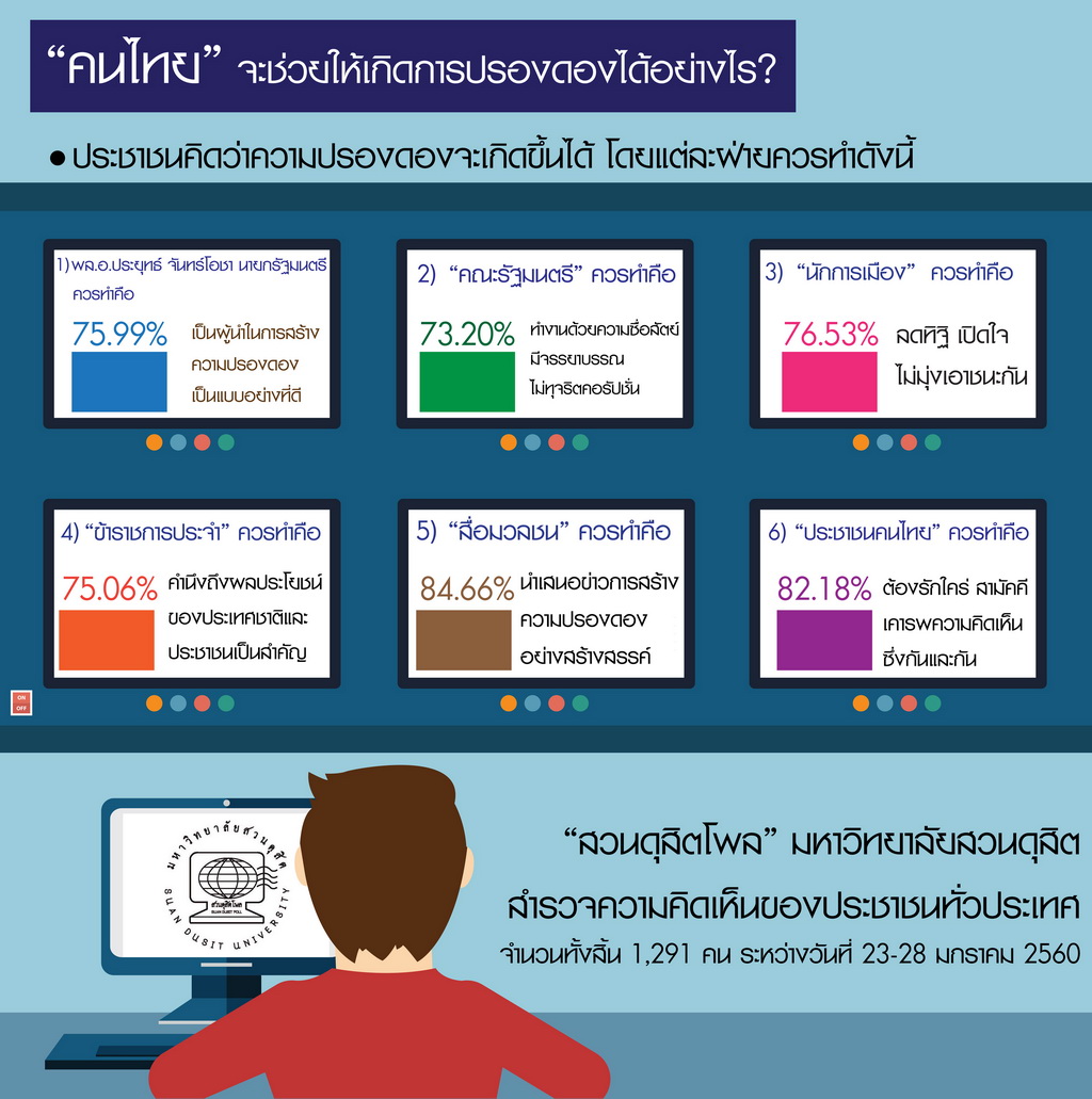 เพื่อสะท้อนแนวทางการมีส่วนร่วมในการสร้างความปรองดอง “สวนดุสิตโพล” ได้สำรวจความคิดเห็นประชาชน 1,291 คน ระหว่างวันที่ 23–28 มกราคม 2560 พบว่าประชาชนเห็นว่า พล.อ.ประยุทธ์ จันทร์โอชา ควรเป็นผู้นำด้านความปรองดอง (75.99%) พร้อมเปิดรับฟังประชาชน คณะรัฐมนตรีควรทำงานสุจริต ข้าราชการต้องโปร่งใส นักการเมืองควรลดทิฐิและเคารพกฎหมาย (76.53%) สื่อมวลชนควรนำเสนอข่าวอย่างสร้างสรรค์และเป็นกลาง (84.66%) ขณะที่ประชาชนทั่วไปควรมีสามัคคีและใช้วิจารณญาณในการรับรู้ข้อมูล