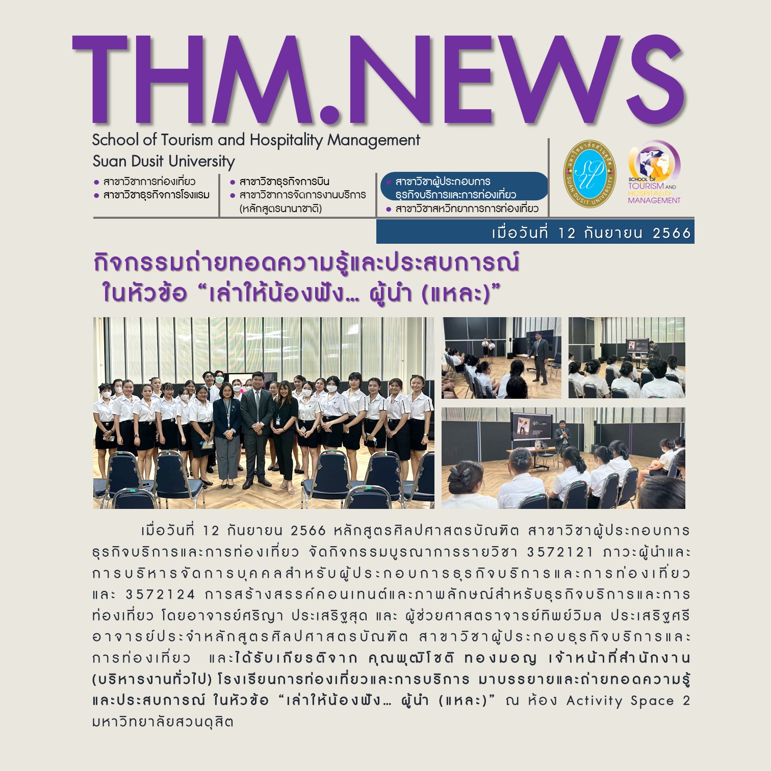 เมื่อวันที่ 12 กันยายน 2566 หลักสูตรศิลปศาสตรบัณฑิต สาขาวิชาผู้ประกอบการธุรกิจบริการและการท่องเที่ยว จัดกิจกรรมบูรณาการรายวิชา 3572121 ภาวะผู้นำและการบริหารจัดการบุคคลสำหรับผู้ประกอบการธุรกิจบริการและการท่องเที่ยวและ 3572124 การสร้างสรรค์คอนเทนต์และภาพลักษณ์สำหรับธุรกิจบริการและการท่องเที่ยว โดยอาจารย์ศริญา ประเสริฐสุด และ ผู้ช่วยศาสตราจารย์ทิพย์วิมล ประเสริฐศรี อาจารย์ประจำหลักสูตรศิลปศาสตรบัณฑิต สาขาวิชาผู้ประกอบธุรกิจบริการและการท่องเที่ยว และได้รับเกียรติจาก คุณพุฒิโชติ ทองมอญ เจ้าหน้าที่สำนักงาน (บริหารงานทั่วไป) โรงเรียนการท่องเที่ยวและการบริการ มาบรรยายและถ่ายทอดความรู้และประสบการณ์ ในหัวข้อ “เล่าให้น้องฟัง... ผู้นำ (แหละ)” ณ ห้อง Activity Space 2 มหาวิทยาลัยสวนดุสิต