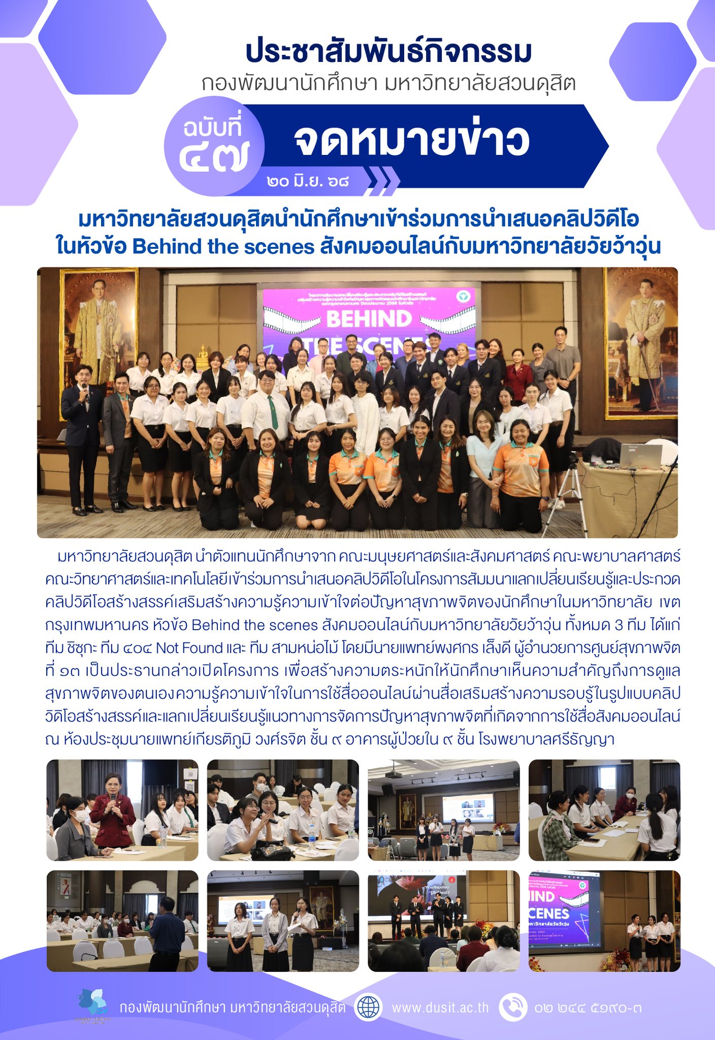 มหาวิทยาลัยสวนดุสิตนำนักศึกษาเข้าร่วมการนำเสนอคลิปวิดีโอ ในหัวข้อ Behind the scenes สังคมออนไลน์กับมหาวิทยาลัยวัยว้าวุ่น