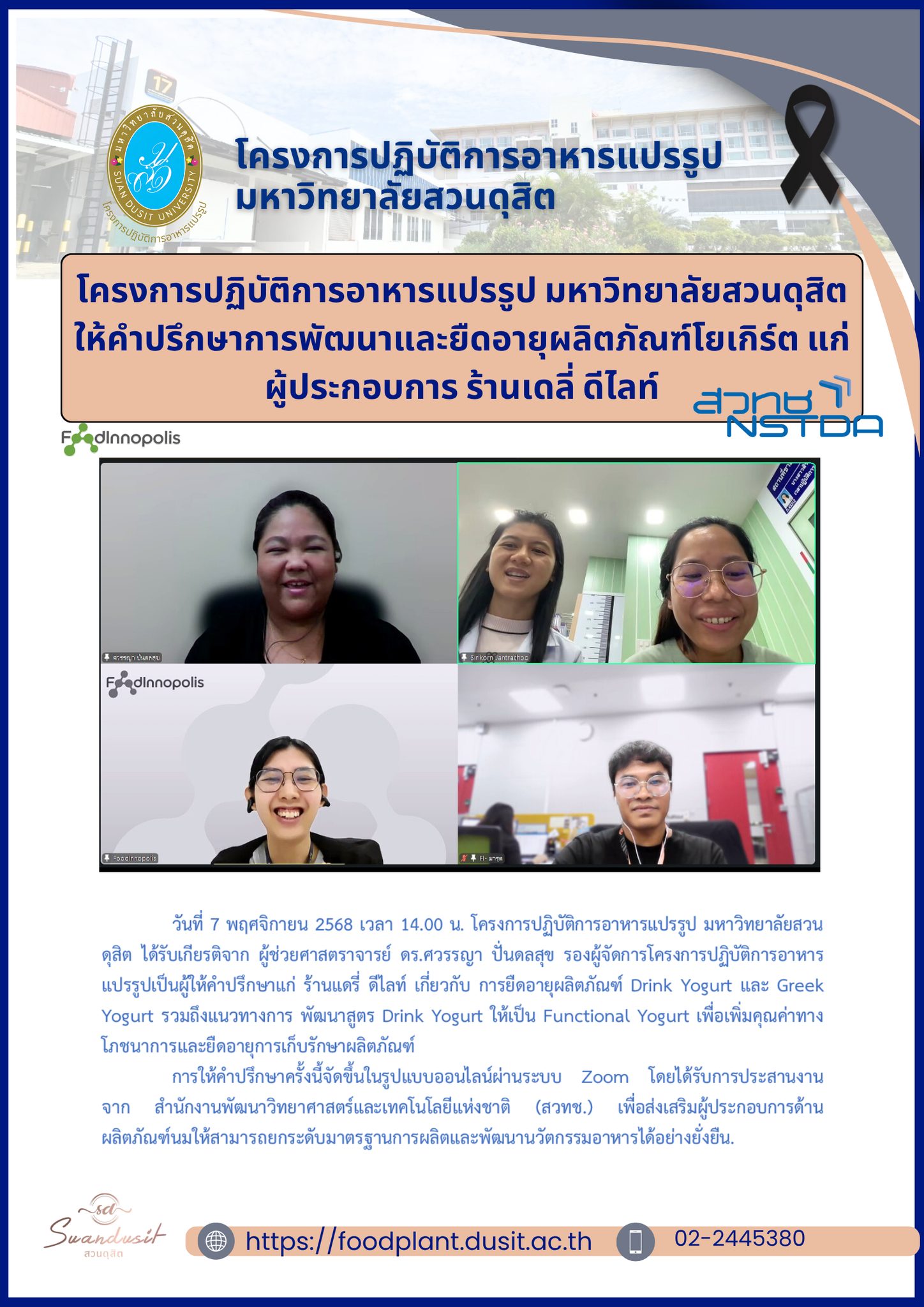 ในวันที่ 7 พฤศจิกายน 2568 เวลา 14.00 น. โครงการปฏิบัติการอาหารแปรรูป มหาวิทยาลัยสวนดุสิต ได้รับเกียรติจาก ผู้ช่วยศาสตราจารย์ ดร.ศวรรญา ปั่นดลสุข รองผู้จัดการโครงการปฏิบัติการอาหารแปรรูป เป็นผู้ให้คำปรึกษาแก่ ร้านแดรี่ ดีไลท์ เกี่ยวกับ การยืดอายุผลิตภัณฑ์ Drink Yogurt และ Greek Yogurt รวมถึงแนวทางการ พัฒนาสูตร Drink Yogurt ให้เป็น Functional Yogurt เพื่อเพิ่มคุณค่าทางโภชนาการและยืดอายุการเก็บรักษาผลิตภัณฑ์ การให้คำปรึกษาครั้งนี้จัดขึ้นในรูปแบบออนไลน์ผ่านระบบ Zoom โดยได้รับการประสานงานจาก สำนักงานพัฒนาวิทยาศาสตร์และเทคโนโลยีแห่งชาติ (สวทช.) เพื่อส่งเสริมผู้ประกอบการด้านผลิตภัณฑ์นมให้สามารถยกระดับมาตรฐานการผลิตและพัฒนานวัตกรรมอาหารได้อย่างยั่งยืน