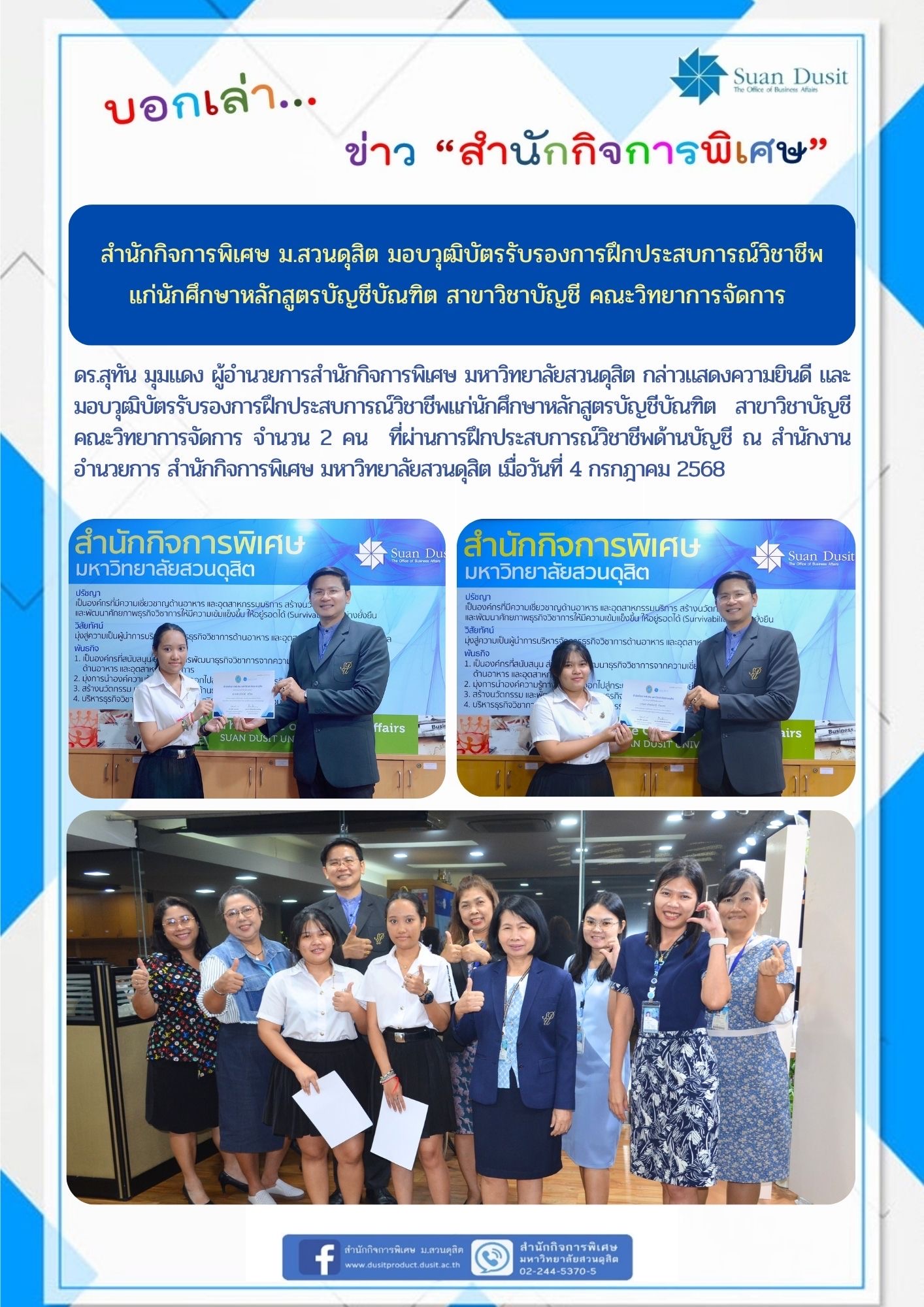 นักศึกษาหลักสูตรบัญชีบัณฑิต สาขาวิชาบัญชี คณะวิทยาการจัดการ จำนวน 2 คน ที่ผ่านการฝึกประสบการณ์วิชาชีพด้านบัญชี ณ สำนักงานอำนวยการ สำนักกิจการพิเศษ มหาวิทยาลัยสวนดุสิต เมื่อวันที่ 4 กรกฎาคม 2568