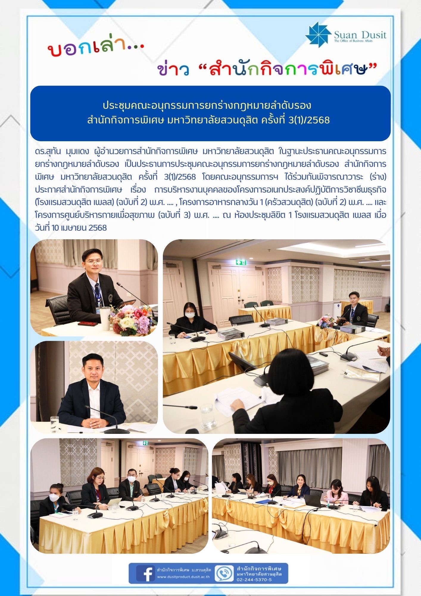 ประชุมคณะอนุกรรมการยกร่างกฎหมายลำดับรอง สำนักกิจการพิเศษ มหาวิทยาลัยสวนดุสิต ครั้งที่ 3(1)/2568