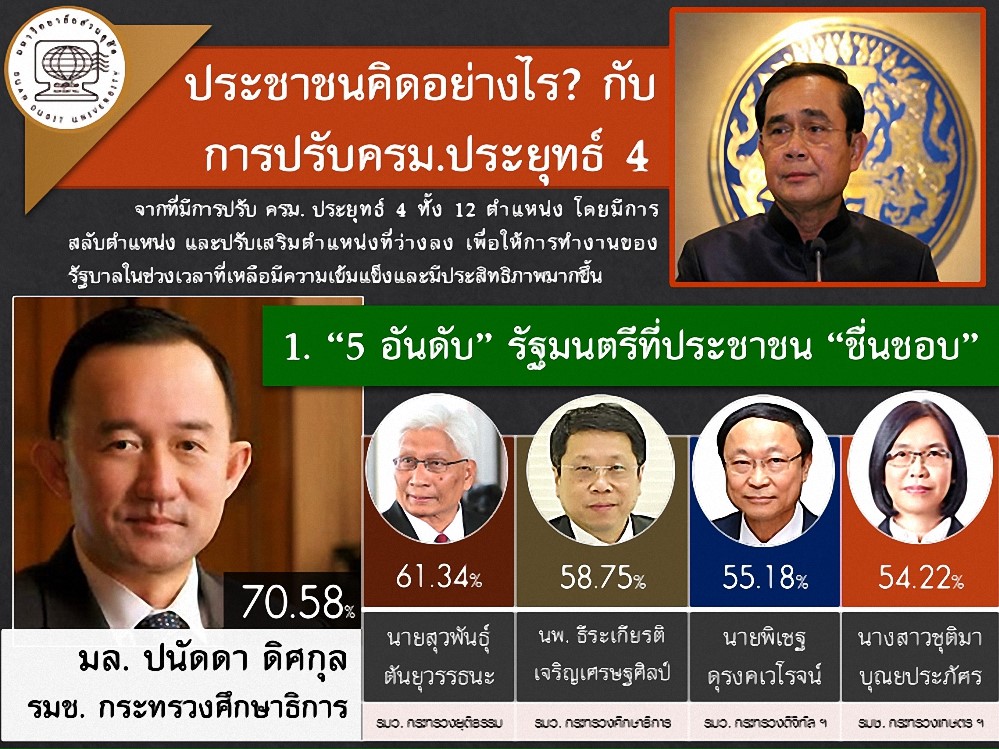 หลังการปรับคณะรัฐมนตรี (ครม.) ประยุทธ์ 4 จำนวน 12 ตำแหน่ง เพื่อเสริมความแข็งแกร่งในการบริหารช่วงท้ายของรัฐบาล “สวนดุสิตโพล” ได้สำรวจความคิดเห็นของประชาชนทั่วประเทศจำนวน 1,363 คน ระหว่างวันที่ 19–23 ธันวาคม 2559 ผลสำรวจพบว่า ประชาชน “ค่อนข้างพอใจ” กับการปรับ ครม. ครั้งนี้ โดยให้เหตุผลว่าผู้ที่ได้รับตำแหน่งมีความรู้ความสามารถและสานต่องานจากกระทรวงเดิมได้อย่างต่อเนื่อง รัฐมนตรีที่ประชาชนชื่นชอบมากที่สุดคือ ม.ล.ปนัดดา ดิศกุล รองลงมาคือ นายสุวพันธุ์ และ นพ.ธีระเกียรติ ขณะเดียวกัน ประชาชนยังรู้สึกหนักใจแทนนายกรัฐมนตรีในประเด็นปากท้องประชาชน เศรษฐกิจ การช่วยเหลือเกษตรกร การต่อต้าน พ.ร.บ.คอมพิวเตอร์ และการดำเนินตามโรดแมปก่อนการเลือกตั้ง สะท้อนถึงความคาดหวังของสังคมต่อประสิทธิภาพของทีม ครม. ใหม่ในการแก้ปัญหาเร่งด่วนของประเทศในช่วงเวลาที่เหลือ