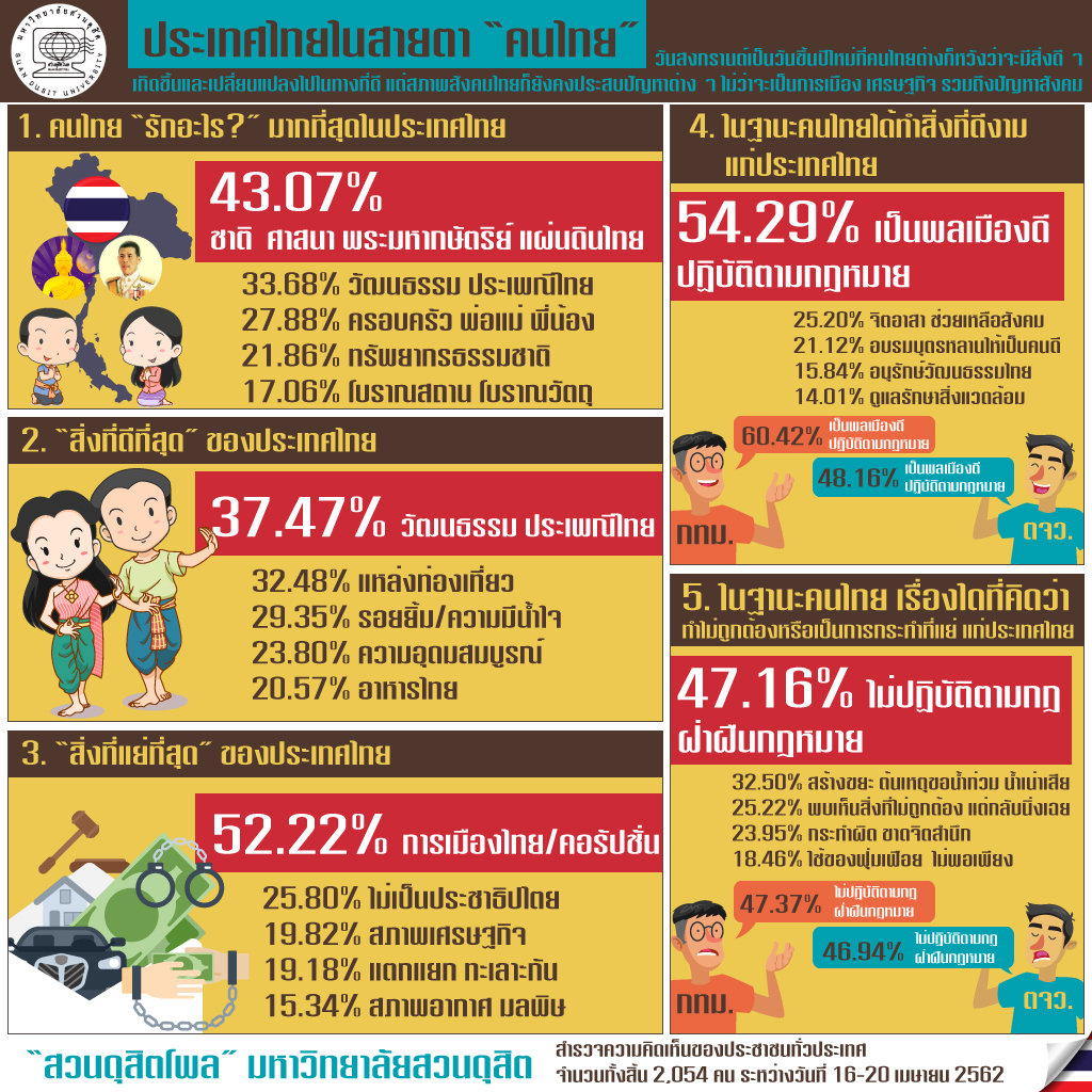 สวนดุสิตโพล มหาวิทยาลัยสวนดุสิต ได้สำรวจความคิดเห็นของประชาชนทั่วประเทศจำนวน 2,054 คน ระหว่างวันที่ 16–20 เมษายน 2562 ภายใต้หัวข้อ “ประเทศไทยในสายตาคนไทย” พบว่า คนไทยส่วนใหญ่ (43.07%) รักชาติ ศาสนา พระมหากษัตริย์ รองลงมา คือวัฒนธรรมและเอกลักษณ์ไทย (33.68%) และครอบครัว (27.88%) สิ่งที่ดีที่สุดของประเทศไทย คือวัฒนธรรมไทย (37.47%) สถานที่ท่องเที่ยว (32.48%) และรอยยิ้ม น้ำใจของคนไทย (29.35%) ขณะที่สิ่งที่แย่ที่สุดคือ การเมืองและพฤติกรรมของนักการเมือง (52.22%) การขาดเสรีภาพและประชาธิปไตย (25.80%) และสภาพเศรษฐกิจ (19.82%) ด้านพฤติกรรมที่ดีงาม คนไทยร้อยละ 54.29 ระบุว่าเป็นพลเมืองดี ซื่อสัตย์ และปฏิบัติตามกฎหมาย ขณะที่พฤติกรรมที่ไม่เหมาะสม ได้แก่ การไม่ปฏิบัติตามกฎหมาย (47.16%) การสร้างขยะ (32.50%) และการนิ่งเฉยเมื่อพบสิ่งไม่ถูกต้อง (25.22%) ผลสำรวจนี้สะท้อนให้เห็นถึงความรักในชาติและวัฒนธรรม ตลอดจนความห่วงใยของประชาชนต่อปัญหาเรื้อรังในสังคมไทย