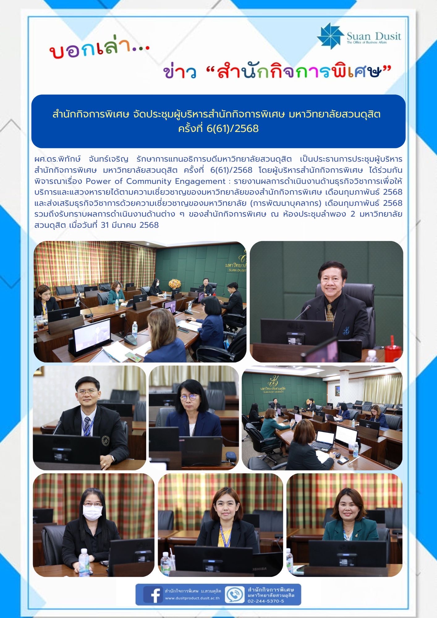 โดยผู้บริหารสำนักกิจการพิเศษ ได้ร่วมกันพิจารณาเรื่อง Power of Community Engagement : รายงานผลการดำเนินงานด้านธุรกิจวิชาการเพื่อให้บริการและแสวงหารายได้ตามความเชี่ยวชาญของมหาวิทยาลัยของโครงการในกำกับและสำนักงานอำนวยการ สำนักกิจการพิเศษ เดือนกุมภาพันธ์ 2568 , Power of Community Engagement : ส่งเสริมธุรกิจวิชาการด้วยความเชี่ยวชาญของมหาวิทยาลัย (การพัฒนาบุคลากร) เดือนกุมภาพันธ์ 2568 รวมถึงรับทราบผลการดำเนินงานด้านต่าง ๆ ของสำนักกิจการพิเศษ ณ ห้องประชุมลำพอง 2 มหาวิทยาลัยสวนดุสิต เมื่อวันที่ 31 มีนาคม 2568