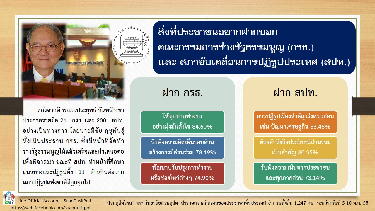 ภายหลังการแต่งตั้งคณะกรรมการร่างรัฐธรรมนูญ (กรธ.) จำนวน 21 คน และสภาขับเคลื่อนการปฏิรูปประเทศ (สปท.) จำนวน 200 คน โดยมีนายมีชัย ฤชุพันธุ์ เป็นประธานกรธ. “สวนดุสิตโพล” มหาวิทยาลัยสวนดุสิต ได้จัดทำการสำรวจความคิดเห็นของประชาชนทั่วประเทศจำนวน 1,247 คน ระหว่างวันที่ 5-10 ตุลาคม 2558 เพื่อสะท้อนเสียงประชาชนต่อกรธ. และสปท. ผลสำรวจระบุว่า ประชาชนต้องการให้การร่างรัฐธรรมนูญคำนึงถึงประโยชน์ส่วนรวม ความยุติธรรม และความเป็นประชาธิปไตย ตลอดจนความตั้งใจจริงของคณะกรรมการ ขณะที่ในด้านการปฏิรูปประเทศ ประชาชนเน้นเรื่องการแก้ไขปัญหาเศรษฐกิจ ปากท้อง ความปรองดอง ความซื่อสัตย์ และความร่วมมือระหว่างสมาชิกสปท. รวมถึงการศึกษาที่มีคุณภาพ และการต่อต้านการทุจริต โพลนี้สะท้อนให้เห็นถึงความคาดหวังอย่างสูงของประชาชนต่อกระบวนการปฏิรูปและร่างรัฐธรรมนูญ ซึ่งถือเป็นพื้นฐานสำคัญของการพัฒนาประเทศอย่างยั่งยืน