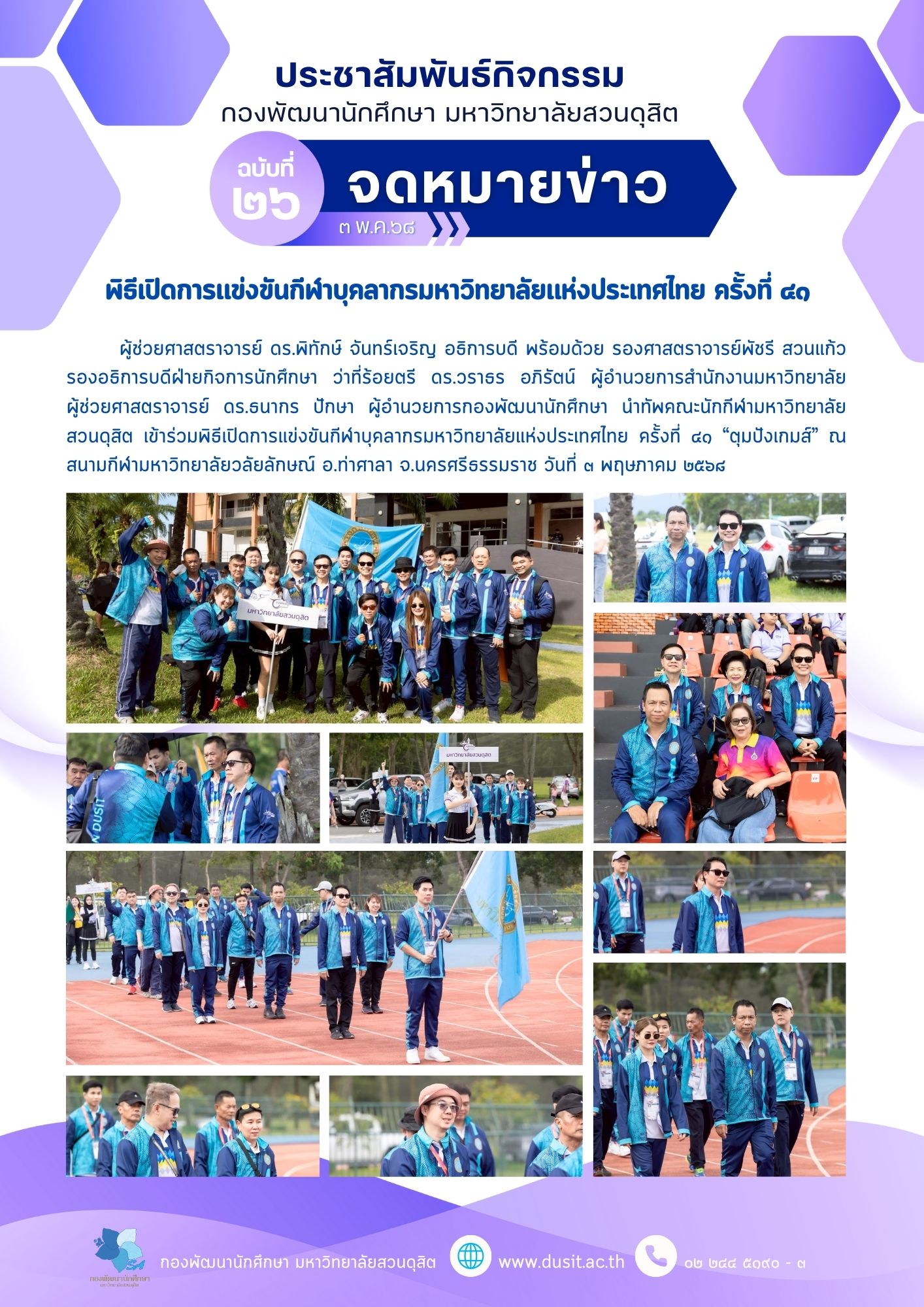 ผู้ช่วยศาสตราจารย์ ดร.พิทักษ์ จันทร์เจริญ อธิการบดี พร้อมด้วย รองศาศาสตราจารย์พัชรี สวนแก้ว รองอธิการบดีฝ่ายกิจการนักศึกษา ว่าที่ร้อยตรี ดร.วราธร อภิรัตน์ ผู้อำนวยการสำนักงานมหาวิทยาลัย ผู้ช่วยศาสตราจารย์ ดร.ธนากร ปักษา ผู้อำนวยการกองพัฒนานักศึกษา นำทัพคณะนักกีฬามหาวิทยาลัยสวนดุสิต เข้าร่วมพิธีเปิดการแข่งขันกีฬาบุคลากรมหาวิทยาลัยแห่งประเทศไทย ครั้งที่ ๔๑ "ตุมปังเกมส์" ณ สนามกีฬามหาวิทยาลัยวลัยลักษณ์ อ.ท่าศาลา จ.นครศรีธรรมราช วันที่ ๓ พฤษภาคม ๒๕๖๘