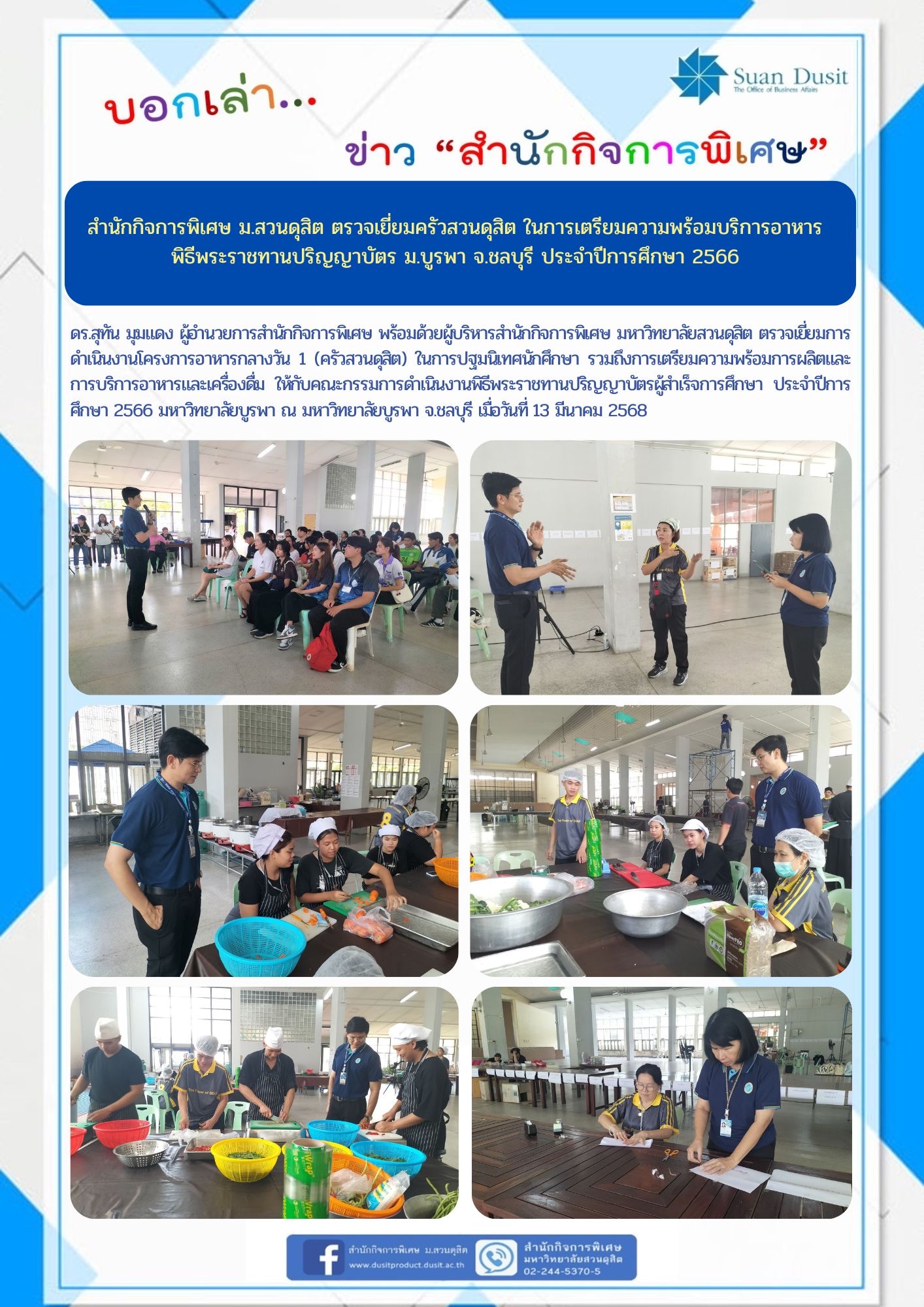 ดร.สุทัน มุมแดง ผู้อำนวยการสำนักกิจการพิเศษ พร้อมด้วยผู้บริหารสำนักกิจการพิเศษ มหาวิทยาลัยสวนดุสิต ตรวจเยี่ยมการดำเนินงานโครงการอาหารกลางวัน 1 (ครัวสวนดุสิต) ในการปฐมนิเทศนักศึกษา รวมถึงการเตรียมความพร้อมการผลิตและการบริการอาหารและเครื่องดื่ม ให้กับคณะกรรมการดำเนินงานพิธีพระราชทานปริญญาบัตรผู้สำเร็จการศึกษา ประจำปีการศึกษา 2566 มหาวิทยาลัยบูรพา ณ มหาวิทยาลัยบูรพา จ.ชลบุรี เมื่อวันที่ 13 มีนาคม 2568
