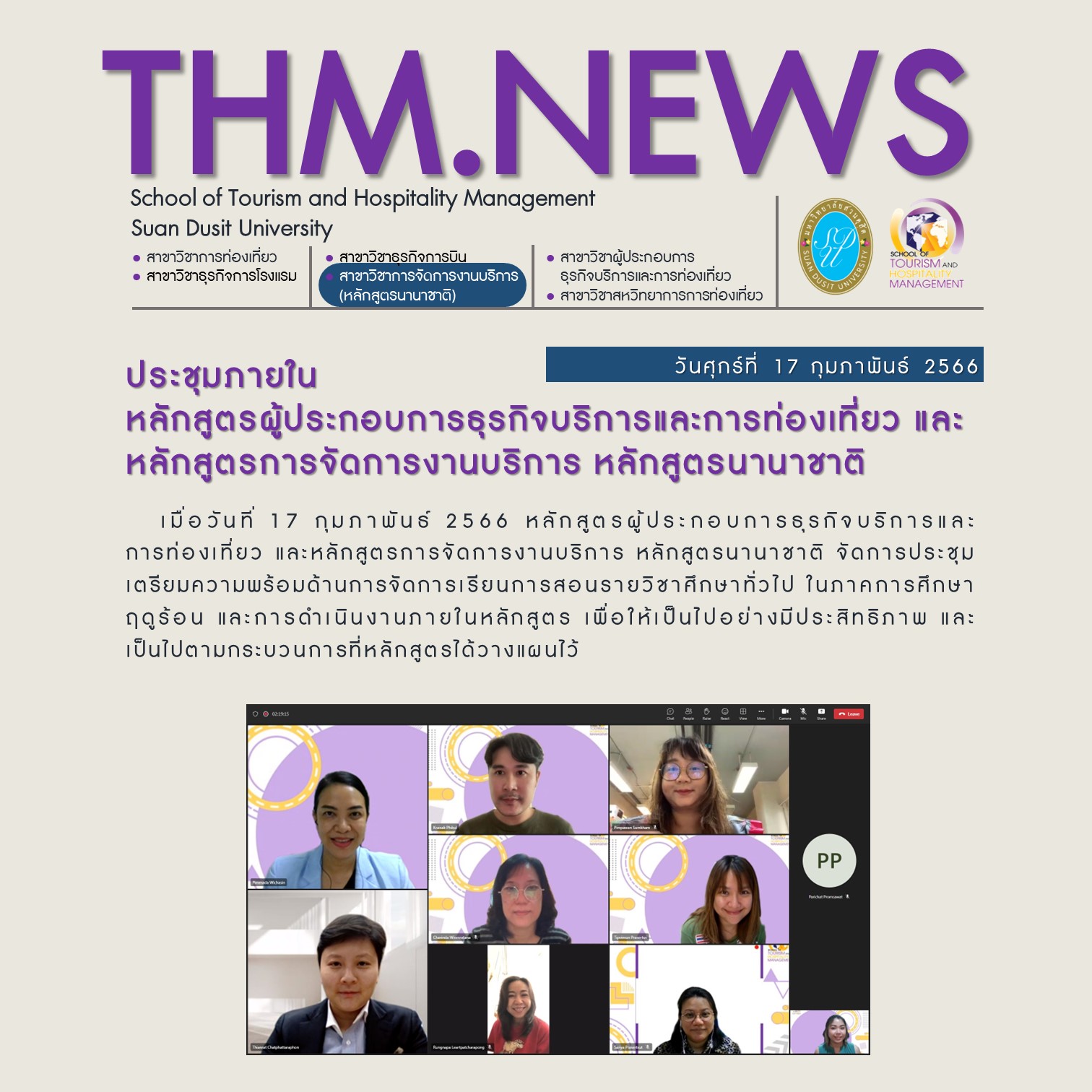 เมื่อวันที่ 17 กุมภาพันธ์ 2566 หลักสูตรผู้ประกอบการธุรกิจบริการและการท่องเที่ยว และหลักสูตรการจัดการงานบริการ หลักสูตรนานาชาติ จัดการประชุมเตรียมความพร้อมด้านการจัดการเรียนการสอนรายวิชาศึกษาทั่วไป ในภาคการศึกษาฤดูร้อน และการดำเนินงานภายในหลักสูตร เพื่อให้เป็นไปอย่างมีประสิทธิภาพ และเป็นไปตามกระบวนการที่หลักสูตรได้วางแผนไว้