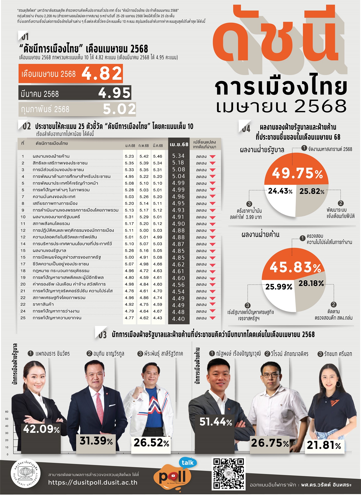 สวนดุสิตโพล มหาวิทยาลัยสวนดุสิต เผยผลสำรวจความคิดเห็นของประชาชนเรื่อง “ดัชนีการเมืองไทย” ประจำเดือนเมษายน 2568 พบว่าคะแนนเฉลี่ยลดลงอยู่ที่ 4.82 จากคะแนนเต็ม 10 ลดลงจากเดือนมีนาคม (4.95) และกุมภาพันธ์ (5.02) อย่างต่อเนื่อง โดยดัชนีทั้ง 25 ตัวชี้วัดต่างมีแนวโน้มลดลง โดยเฉพาะด้านความเชื่อมั่นของประชาชนต่อรัฐบาล การดำเนินนโยบายเพื่อประชาชน และการมีส่วนร่วมของประชาชนในระบอบประชาธิปไตย ขณะที่ผลการทำงานของฝ่ายรัฐบาลที่ประชาชนพึงพอใจมากที่สุดคือ การตรึงราคาน้ำมัน (49.75%) ส่วนฝ่ายฝ่ายค้านได้รับการชื่นชมเรื่องการตรวจสอบการใช้อำนาจรัฐ (45.83%) ด้านนักการเมืองที่ประชาชนชื่นชอบฝ่ายรัฐบาลมากที่สุดคือ แพทองธาร ชินวัตร (42.09%) และฝ่ายค้านคือ พิธา ลิ้มเจริญรัตน์ (51.44%) สะท้อนให้เห็นถึงความต้องการผู้นำทางการเมืองที่เข้าถึงประชาชน โปร่งใส และมีประสิทธิภาพในการแก้ปัญหาอย่างเป็นรูปธรรม ทั้งนี้ ข้อมูลดังกล่าวสามารถใช้เป็นแนวทางในการพัฒนานโยบายและเสริมสร้างความเชื่อมั่นของประชาชนต่อการเมืองไทยในอนาคตได้