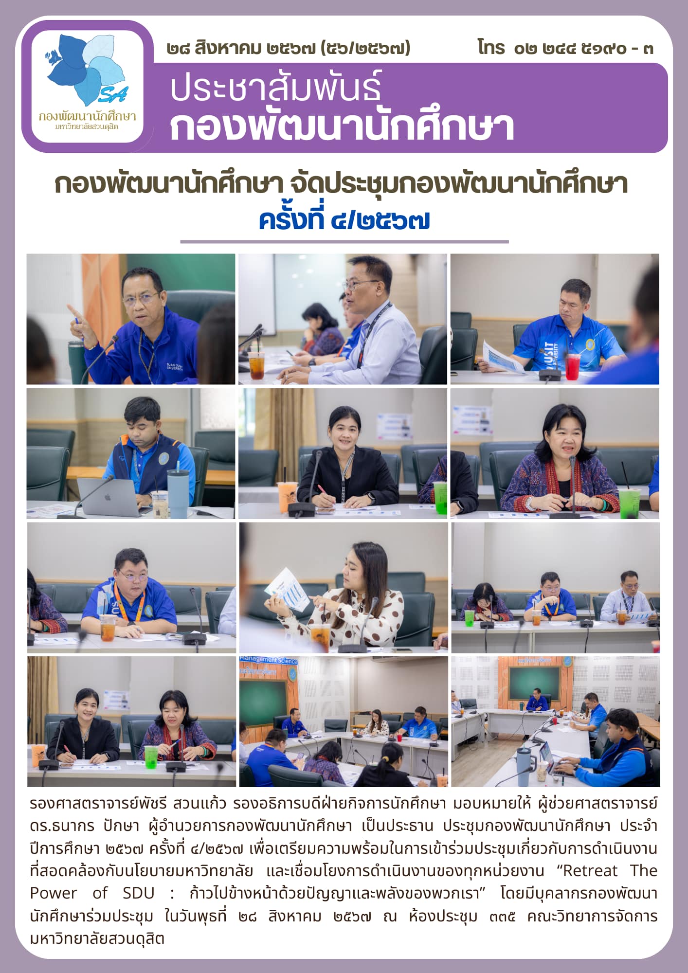 รองศาสตราจารย์พัชรี สวนแก้ว รองอธิการบดีฝ่ายกิจการนักศึกษา มอบหมายให้ ผู้ช่วยศาสตราจารย์ ดร.ธนากร ปักษา ผู้อำนวยการกองพัฒนานักศึกษา เป็นประธาน ประชุมกองพัฒนานักศึกษา ประจำ ปีการศึกษา ๒๕๖๗ ครั้งที่ ๔/๒๕๖๗ เพื่อเตรียมความพร้อมในการเข้าร่วมประชุมเกี่ยวกับการดำเนินงานที่สอดคล้องกับนโยบายมหาวิทยาลัย และเชื่อมโยงการดำเนินงานของทุกหน่วยงาน “Retreat The Power of SDU : ก้าวไปข้างหน้าด้วยปัญญาและพลังของพวกเรา” โดยมีบุคลากรกองพัฒนานักศึกษาร่วมประชุม ในวันพุธที่ ๒๘ สิงหาคม ๒๕๖๗ ณ ห้องประชุม ๓๓๕ คณะวิทยาการจัดการ มหาวิทยาลัยสวนดุสิต