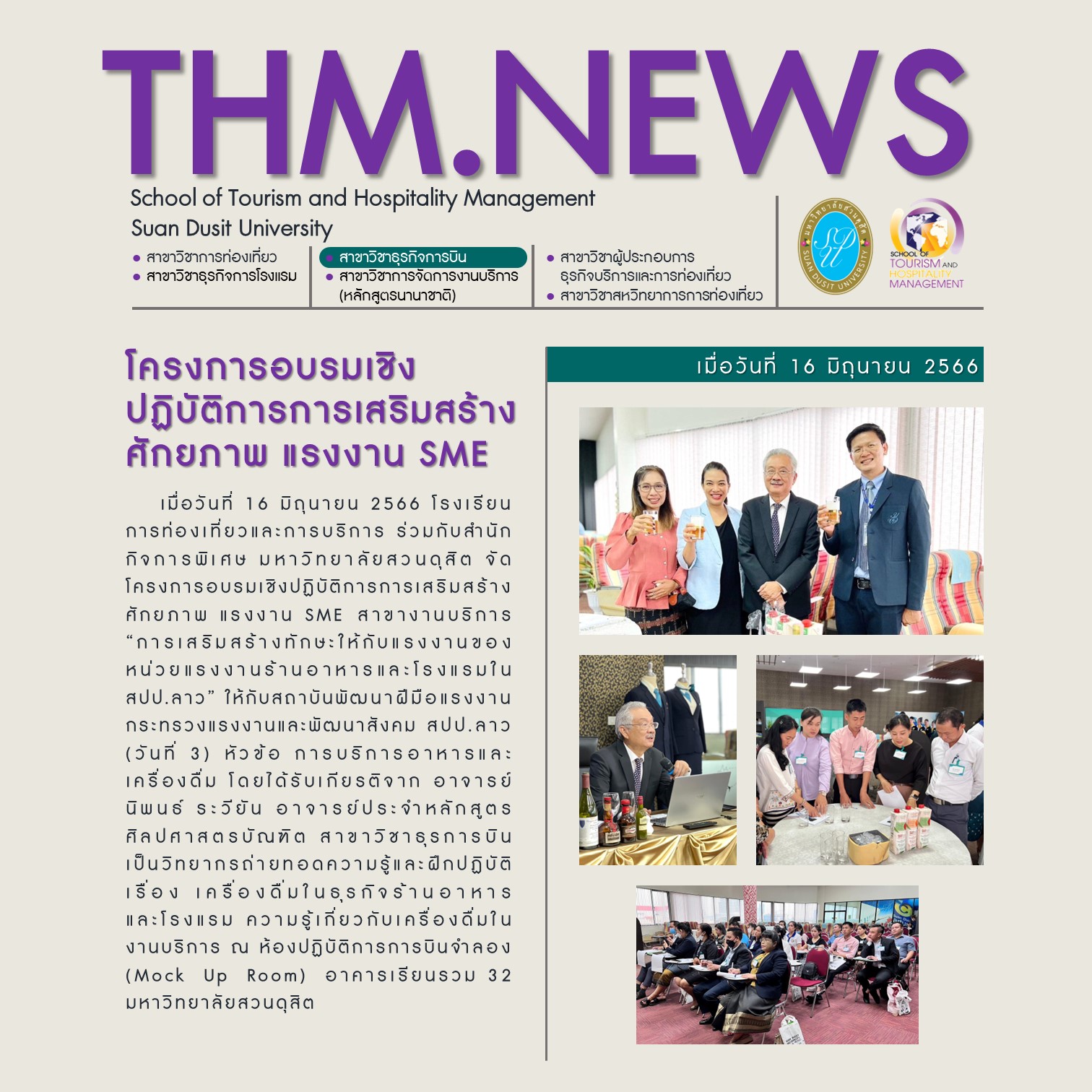 เมื่อวันที่ 16 มิถุนายน 2566 โรงเรียนการท่องเที่ยวและการบริการ ร่วมกับสำนักกิจการพิเศษ มหาวิทยาลัยสวนดุสิต จัดโครงการอบรมเชิงปฏิบัติการการเสริมสร้างศักยภาพแรงงาน SME สาขางานบริการ "การเสริมสร้างทักษะให้กับแรงงานของหน่วยแรงงานร้านอาหารและโรงแรมในสปป.ลาว" ให้กับสถาบันพัฒนาฝีมือแรงงานกระทรวงแรงงานและพัฒนาสังคม สปป.ลาว (วันที่ 3) หัวข้อ การบริการอาหารและเครื่องดื่ม โดยได้รับเกียรติจาก อาจารย์นิพนธ์ ระวียัน อาจารย์ประจำหลักสูตรศิลปศาสตรบัณฑิต สาขาธุรกิจการบิน เป็นวิทยากรถ่ายทอดความรู้และปฏิบัติเรื่อง เครื่องดื่มในธุรกิจร้านอาหารและโรงแรม ความรู้เกี่ยวกับเครื่องดื่มในงานบริการ ณ ห้องปฏิบัติการการบินจำลอง (Mock-Up room) อาคารเรียนรวม 32 มหาวิทยาลัยสวนดุสิต