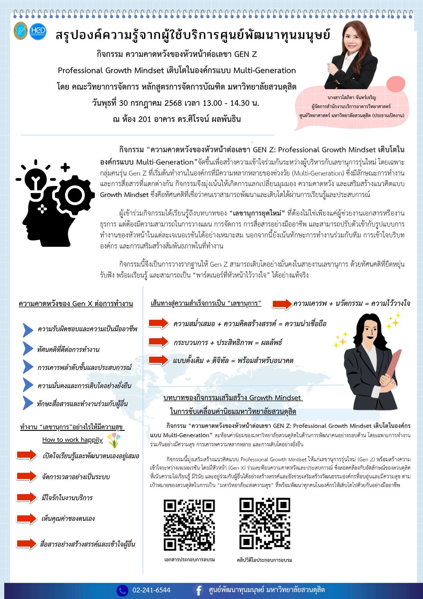 กิจกรรม ความคาดหวังของหัวหน้าต่อเลขา GEN Z: Professional Growth Mindset เติบโตในองค์กรแบบ Multi-Generation จัดขึ้นเพื่อพัฒนาศักยภาพและความเข้าใจในการทำงานของเลขารุ่นใหม่ (GEN Z) ให้สามารถตอบสนองต่อความคาดหวังของหัวหน้าและทำงานร่วมกับบุคลากรจากหลายเจนเนอเรชันได้อย่างมีประสิทธิภาพ กิจกรรมเน้นการเสริมสร้าง Professional Growth Mindset ผ่านการเรียนรู้เชิงปฏิบัติ การฝึกสถานการณ์จำลอง การแลกเปลี่ยนความคิดเห็น และการสะท้อนบทเรียนจากประสบการณ์จริง