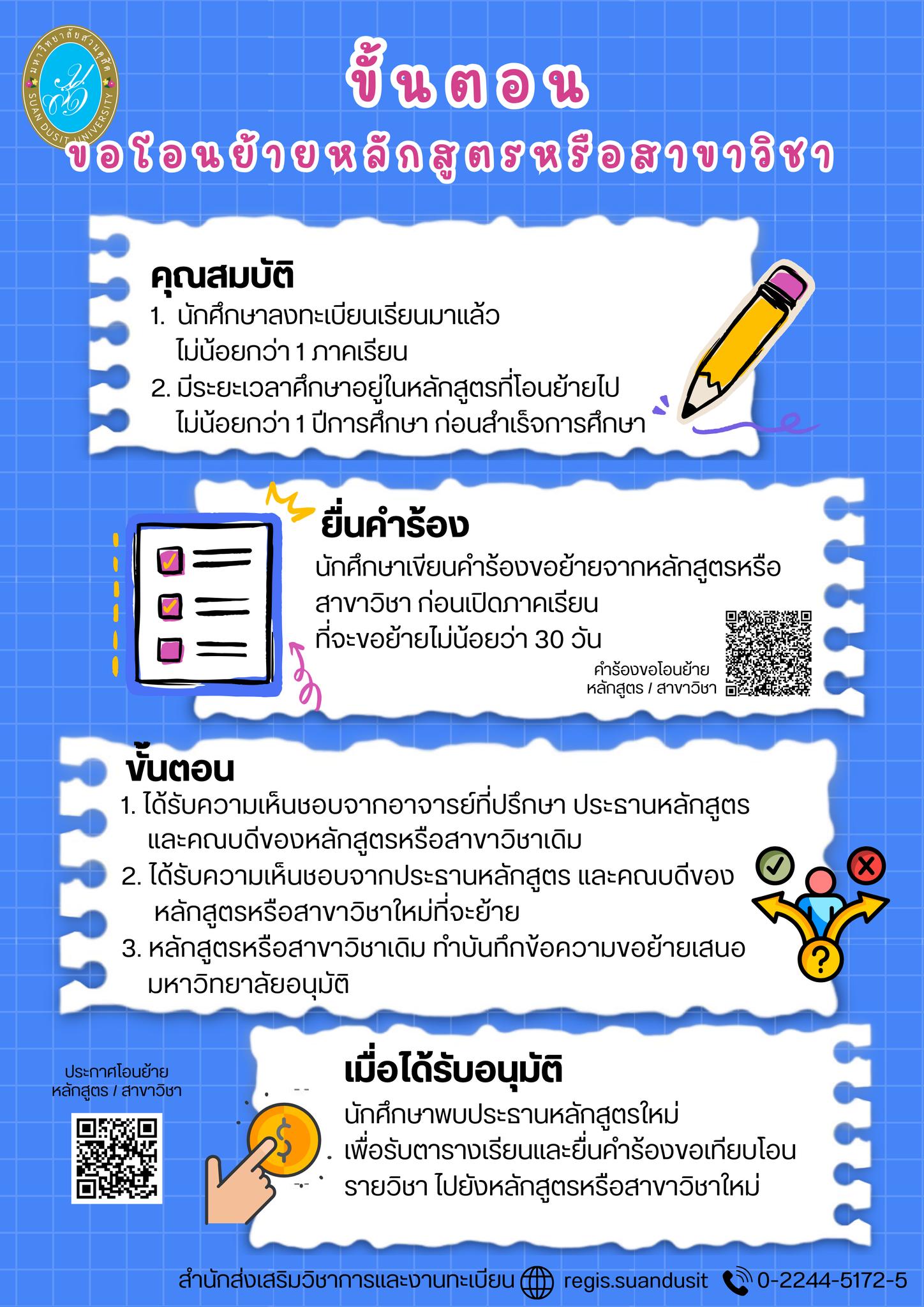 ประชาสัมพันธ์ขั้นตอนสำคัญสำหรับนักศึกษามหาวิทยาลัยสวนดุสิตที่มีความประสงค์จะ ขอโอนย้ายหลักสูตรหรือสาขาวิชา โดยเริ่มจากตรวจสอบคุณสมบัติว่า