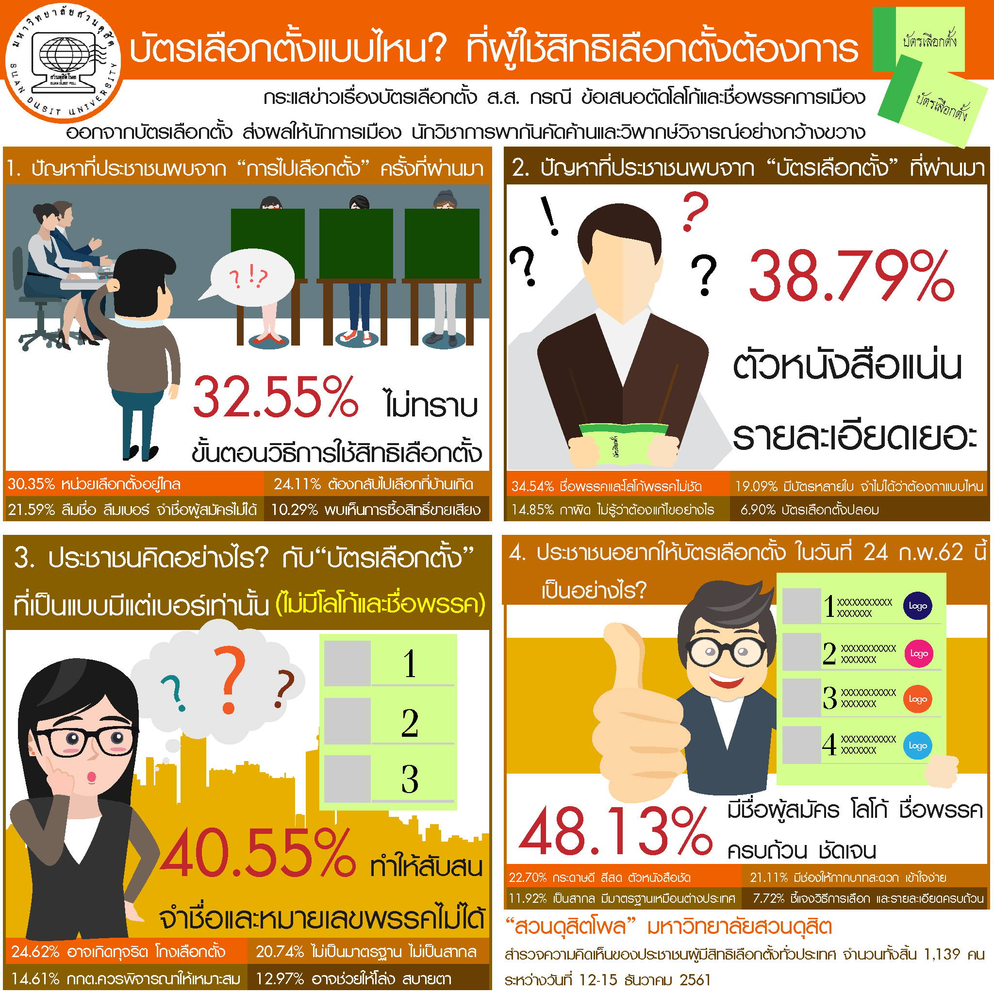 จากกระแสข่าวเกี่ยวกับข้อเสนอให้ตัดโลโก้และชื่อพรรคการเมืองออกจากบัตรเลือกตั้ง ส.ส. “สวนดุสิตโพล” ได้ทำการสำรวจความคิดเห็นของประชาชนจำนวน 1,139 คน ระหว่างวันที่ 12–15 ธันวาคม 2561 เพื่อสะท้อนทัศนะของผู้มีสิทธิเลือกตั้งต่อรูปแบบบัตรเลือกตั้งที่เหมาะสม ผลการสำรวจพบว่า ปัญหาหลักที่ประชาชนพบจากการเลือกตั้งครั้งก่อนคือขั้นตอนที่ซับซ้อน หน่วยเลือกตั้งไกล และการจำรายชื่อหรือเบอร์ผู้สมัครไม่ได้ (32.55%) ส่วนปัญหาเกี่ยวกับบัตรเลือกตั้ง ได้แก่ ตัวหนังสือแน่น ลายตา และโลโก้พรรคไม่ชัดเจน (38.79%)