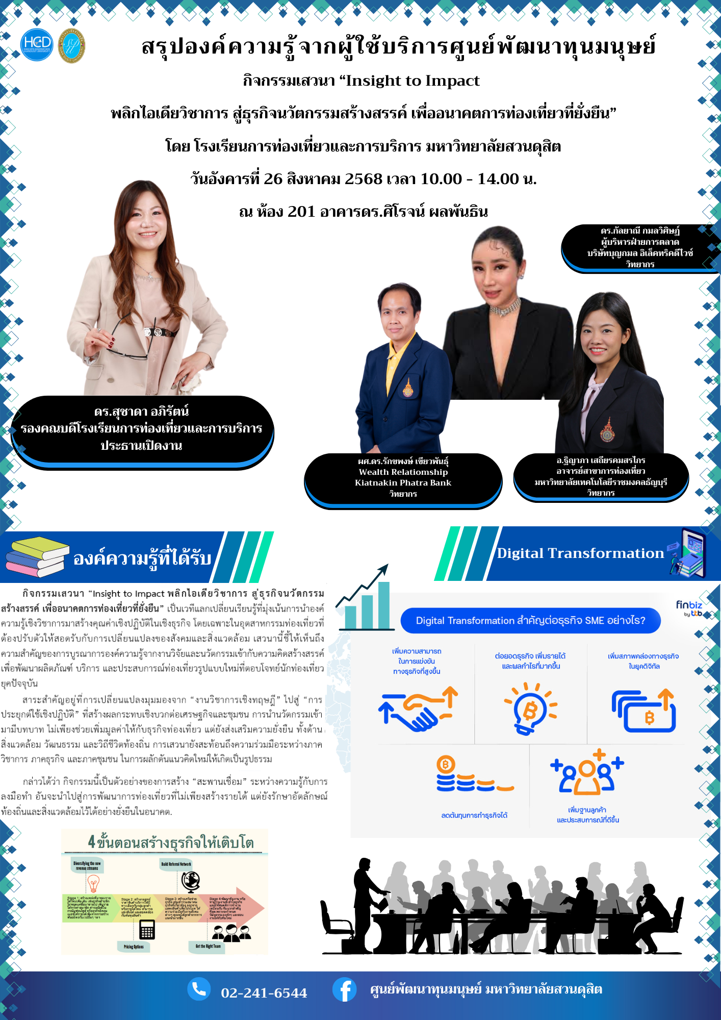 กิจกรรมเสวนา “Insight to Impact พลิกไอเดียวิชาการ สู่ธุรกิจนวัตกรรมสร้างสรรค์ เพื่ออนาคตการท่องเที่ยวที่ยั่งยืน” จัดขึ้นเพื่อเปิดเวทีแลกเปลี่ยนแนวคิดและประสบการณ์ระหว่างนักวิชาการ ผู้ประกอบการ และผู้เกี่ยวข้องในแวดวงการท่องเที่ยว โดยมุ่งเน้นการนำองค์ความรู้เชิงวิชาการมาต่อยอดสู่ธุรกิจนวัตกรรมที่สร้างสรรค์และยั่งยืน เสวนาครั้งนี้ยังชี้ให้เห็นแนวทางการบูรณาการเทคโนโลยี ความคิดสร้างสรรค์ และทุนทางวัฒนธรรม เพื่อสร้างคุณค่าใหม่ให้กับการท่องเที่ยวไทยและเสริมศักยภาพในการแข่งขันระดับสากล