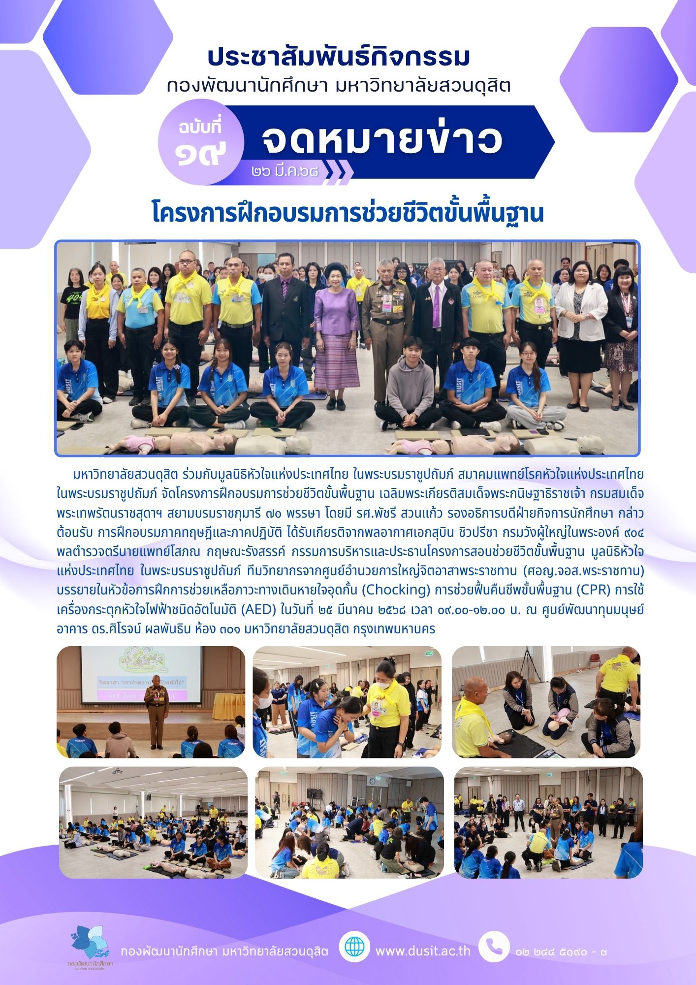 มหาวิทยาลัยสวนดุสิต ร่วมกับมูลนิธิหัวใจแห่งประเทศไทย ในพระบรมราชูปถัมภ์ สมาคมแพทย์โรคหัวใจแห่งประเทศไทยในพระบรมราชูปถัมภ์ จัดโครงการฝึกอบรมการช่วยชีวิตขั้นพื้นฐาน เฉลิมพระเกียรติ สมเด็จพระกนิษฐาธิราชเจ้า กรมสมเด็จพระเทพรัตนราชสุดาฯ สยามบรมราชกุมารี ๗๐ พรรษา เพื่อถวายเป็นพระราชกุศล เฉลิมพระเกียรติสมเด็จพระกนิษฐาธิราชเจ้า กรมสมเด็จพระเทพรัตนราชสุดาฯ สยามบรมราชกุมารี และให้บุคลากร นักศึกษา มหาวิทยาลัยสวนดุสิต ประชาชนทั่วไป ได้รู้จักการช่วยชีวิตขั้นพื้นฐานอย่างมีทักษะที่ถูกต้องตามมาตรฐาน สามารถปฏิบัติการช่วยชีวิตขั้นพื้นฐานให้กับผู้ประสบภัยเบื้องต้นได้ทันท่วงที โดยมี รศ.พัชรี สวนแก้ว รองอธิการบดีฝ่ายกิจการนักศึกษา กล่าวต้อนรับ การฝึกอบรมภาคทฤษฎี และภาคปฏิบัติ ได้รับเกียรติจาก พลอากาศเอก สุบิน ชิวปรีชา กรมวังผู้ใหญ่ในพระองค์ ๙๐๔ พลตำรวจตรีนายแพทย์โสภณ กฤษณะรังสรรค์ กรรมการบริหาร และประธานโครงการสอนช่วยชีวิตขั้นพื้นฐาน มูลนิธิหัวใจแห่งประเทศไทย ในพระบรมราชูปถัมภ์ ทีมวิทยากรจากศูนย์อำนวยการใหญ่จิตอาสาพระราชทาน (ศอญ.จอส.พระราชทาน) บรรยายในหัวข้อ การฝึกการช่วยเหลือภาวะทางเดินหายใจอุดกั้น (Chocking) การช่วยฟื้นคืนชีพขั้นพื้นฐาน (CPR) การใช้เครื่องกระตุกหัวใจไฟฟ้าชนิดอัตโนมัติ (AED) ในวันที่ ๒๕ มีนาคม ๒๕๖๘ เวลา ๐๙.๐๐-๑๒.๐๐ น. ณ ห้อง ๓๐๑ ศูนย์พัฒนาทุนมนุษย์ อาคาร ดร.ศิโรจน์ ผลพันธิน มหาวิทยาลัยสวนดุสิต กรุงเทพมหานคร