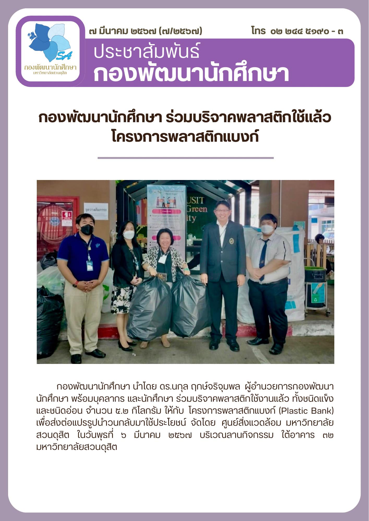 กองพัฒนานักศึกษา นำโดย ดร.นกุล ฤกษ์จริจุมพล ผู้อำนวยการกองพัฒนานักศึกษา พร้อมด้วยบุคลากรและนักศึกษา ร่วมบริจาคพลาสติกใช้แล้ว ทั้งชนิดแข็งและชนิดอ่อน จำนวน 5.2 กิโลกรัม ให้กับ โครงการพลาสติกแบงก์ (Plastic Bank) เพื่อส่งต่อแปรรูปนำวนกลับมาใช้ประโยชน์ จัดโดย ศูนย์สิ่งแวดล้อม มหาวิทยาลัยสวดุสิต ในวันพุธที่ 6 มีนาคม 2567 บริเวณลานกิจกรรม ใต้อาคาร 32 มหาวิทยาลัยสวนดุสิต