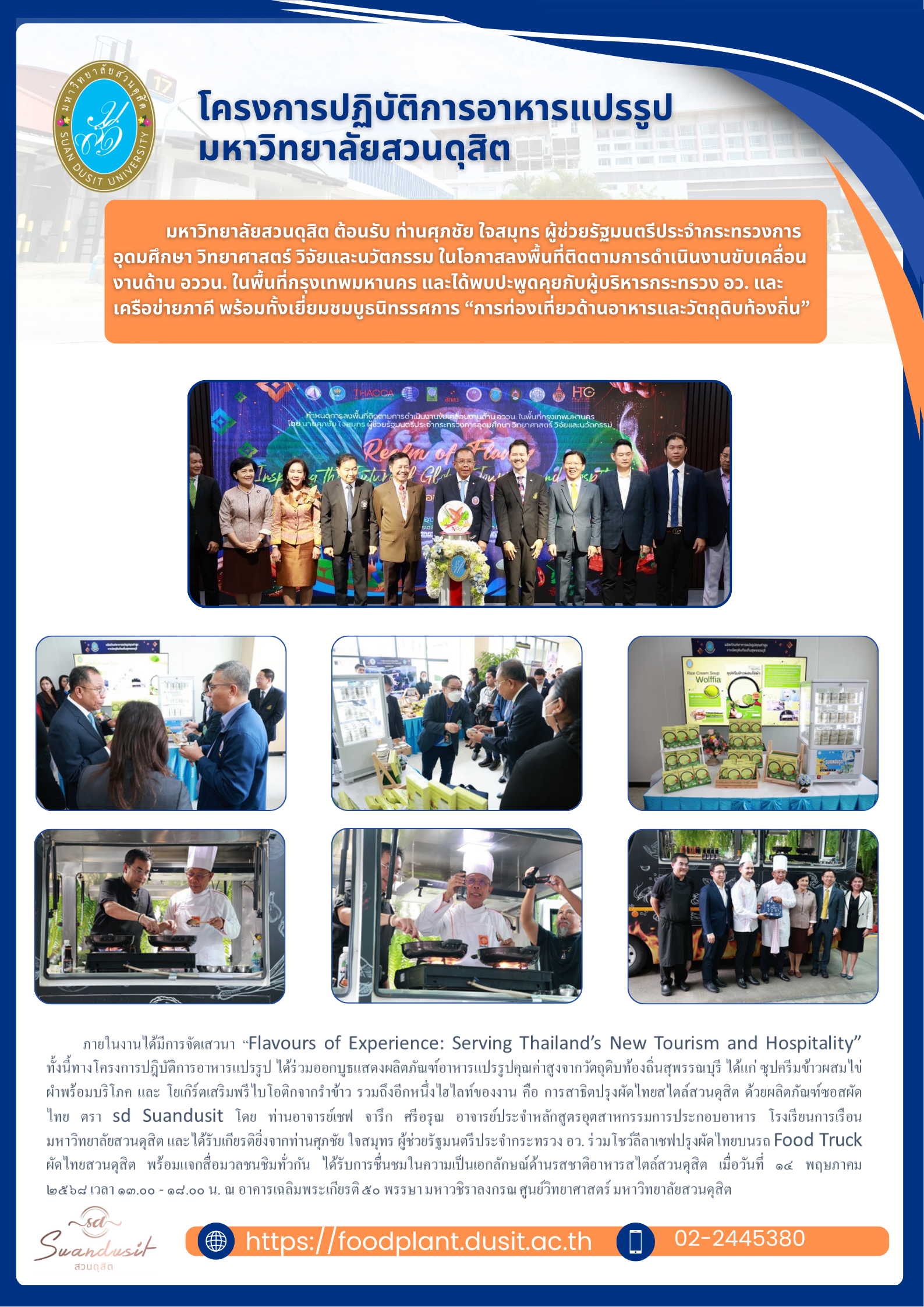 ทางโครงการปฎิบัติการอาหารแปรรูป ได้ร่วมออกบูธแสดงผลิตภัณฑ์อาหารแปรรูปคุณค่าสูงจากวัตถุดิบท้องถิ่นสุพรรณบุรี รวมถึงอีกหนึ่งไฮไลท์ของงาน คือ การสาธิตปรุงผัดไทยสไตล์สวนดุสิต ด้วยผลิตภัณฑ์ซอสผัดไทย ตรา sd Suandusit