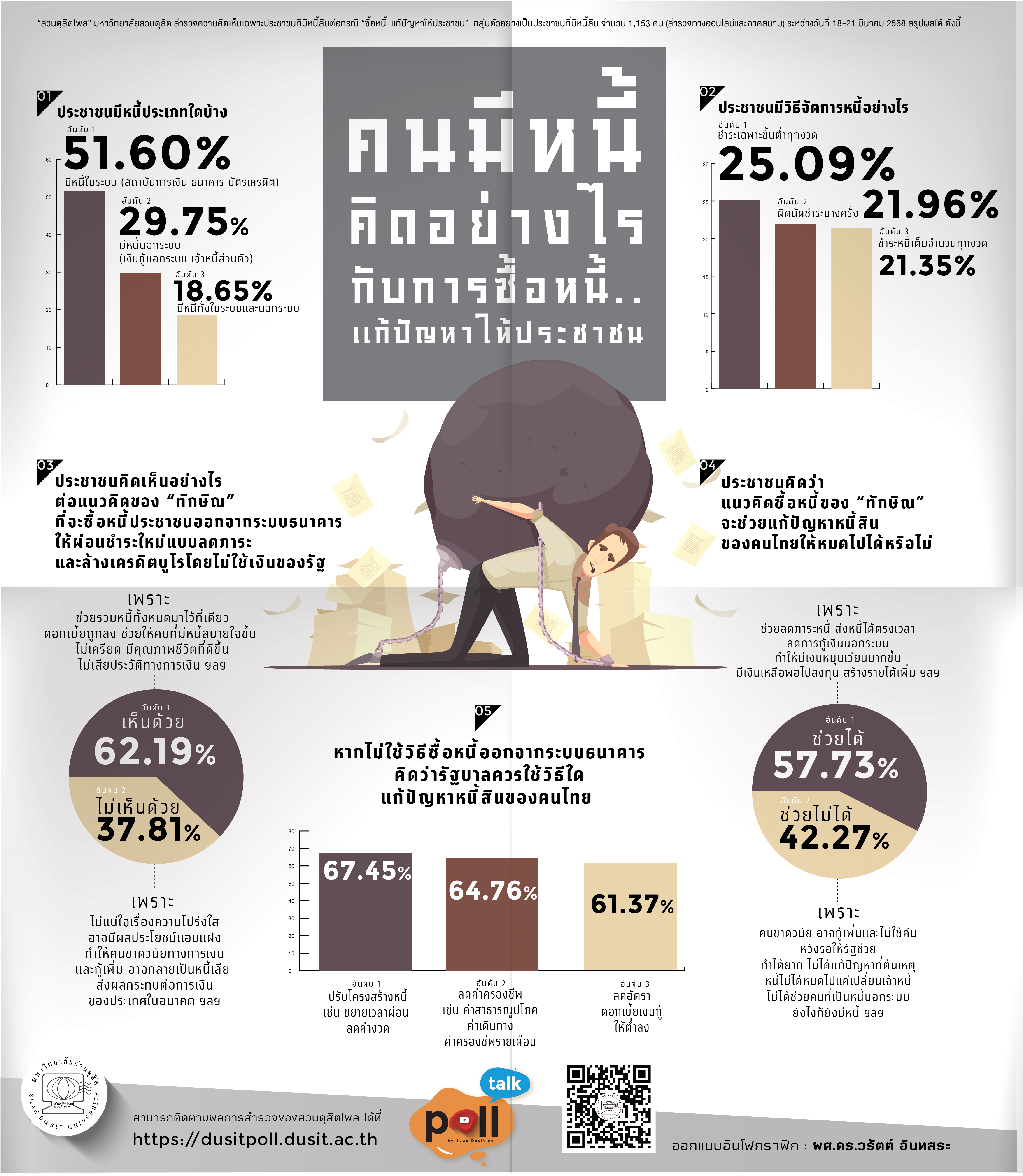 สวนดุสิตโพล มหาวิทยาลัยสวนดุสิต สำรวจความคิดเห็นของประชาชนทั่วประเทศ เรื่อง "ยกหนี้..แก้ปัญหาให้ประชาชน" จากกลุ่มตัวอย่างประชาชนที่มีหนี้สิน 1,153 คน ระหว่างวันที่ 18-21 มีนาคม 2568 พบว่าหนี้ในระบบมีมากที่สุด (ร้อยละ 51.60) และมักชำระขั้นต่ำ (ร้อยละ 25.09) แนวคิด “ทักษิณ” ที่เสนอซื้อหนี้ออกจากระบบธนาคาร ได้รับการสนับสนุนร้อยละ 62.19 เพราะช่วยรวมหนี้ ลดดอกเบี้ย และเพิ่มความสบายใจ อย่างไรก็ตาม ร้อยละ 57.73 เชื่อว่าช่วยแก้ปัญหาหนี้ได้ ขณะที่ร้อยละ 42.27 คิดว่าไม่ได้ผล ทางเลือกอื่นที่แนะนำคือปรับโครงสร้างหนี้ (ร้อยละ 67.45) และลดค่าครองชีพ (ร้อยละ 64.76)