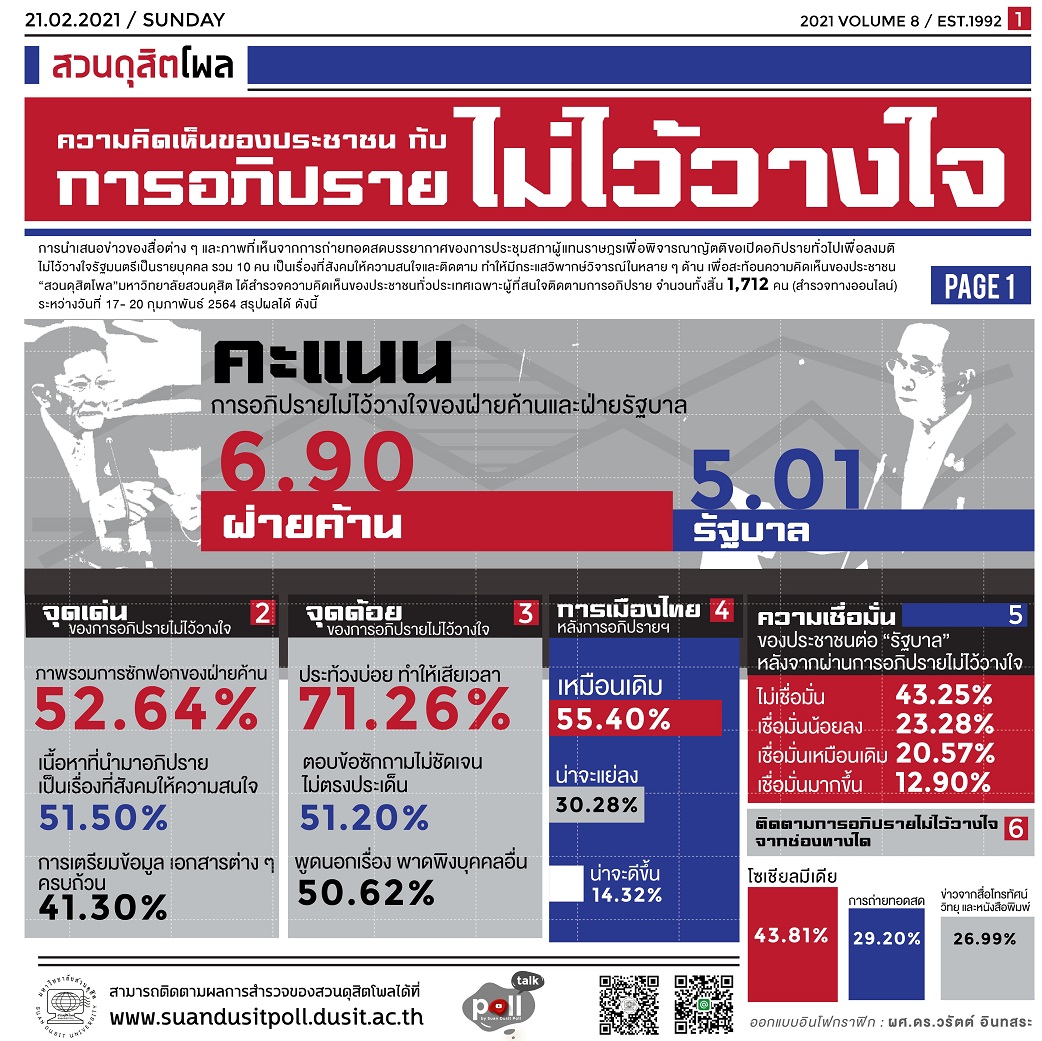 สวนดุสิตโพล มหาวิทยาลัยสวนดุสิต ได้ทำการสำรวจความคิดเห็นของประชาชนทั่วประเทศที่สนใจติดตามการอภิปรายไม่ไว้วางใจรัฐมนตรีเป็นรายบุคคล รวม 10 คน ระหว่างวันที่ 17–20 กุมภาพันธ์ 2564 จากกลุ่มตัวอย่างจำนวน 1,712 คน พบว่า ประชาชนติดตามการอภิปรายผ่านสื่อโซเชียลมีเดียมากที่สุด (43.81%) จุดเด่นของการอภิปรายคือการซักฟอกของฝ่ายค้านที่มีเนื้อหาน่าสนใจ และมีข้อมูลครบถ้วน ส่วนจุดด้อยที่ถูกวิจารณ์มากที่สุดคือการประท้วงบ่อย ทำให้เสียเวลา (71.26%) และการตอบคำถามไม่ชัดเจนของฝ่ายรัฐบาล หลังจบการอภิปราย ประชาชนส่วนใหญ่ (55.40%) เห็นว่าสถานการณ์การเมืองจะยังคงเหมือนเดิม โดยร้อยละ 43.25 ไม่เชื่อมั่นต่อรัฐบาล คะแนนเฉลี่ยที่ให้แก่ฝ่ายค้านคือ 6.90 ขณะที่ฝ่ายรัฐบาลได้ 5.01 คะแนน สะท้อนถึงความไม่พึงพอใจของประชาชนต่อการทำงานของรัฐบาล และความคาดหวังที่มีต่อระบบตรวจสอบในระบอบประชาธิปไตย ที่เน้นการแสดงข้อมูลข้อเท็จจริงและการมีวุฒิภาวะในการอภิปรายเพื่อประโยชน์สาธารณะ