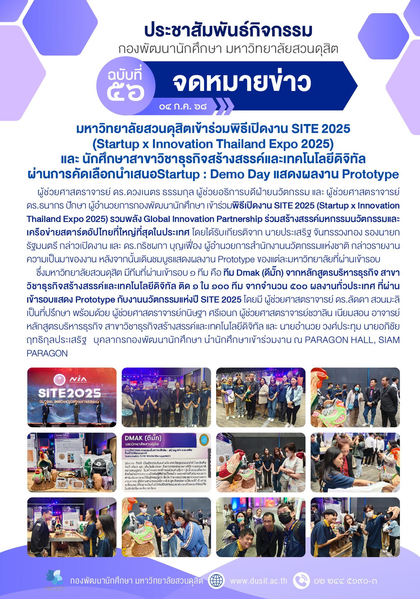 ผู้ช่วยศาสตราจารย์ ดร.ดวงเนตร ธรรมกุล ผู้ช่วยอธิการบดีฝ่ายนวัตกรรม และ ผู้ช่วยศาสตราจารย์ ดร.ธนากร ปักษา ผู้อำนวยการกองพัฒนานักศึกษา เข้าร่วมพิธีเปิดงาน SITE 2025 (Startup x Innovation Thailand Expo 2025) รวมพลัง Global Innovation Partnership ร่วมสร้างสรรค์มหกรรมนวัตกรรมและเครือข่ายสตาร์ทอัพไทยที่ใหญ่ที่สุดในประเทศ โดยได้รับเกียรติจาก นายประเสริฐ จันทรรวงทอง รองนายกรัฐมนตรี กล่าวเปิดงาน และ ดร.กริชผกา บุญเฟื่อง ผู้อำนวยการสำนักงานนวัตกรรมแห่งชาติ กล่าวรายงานความเป็นมาของงาน หลังจากนั้นเดินชมบูธแสดงผลงาน Prototype ของแต่ละมหาวิทยาลัยที่ผ่านเข้ารอบ ซึ่งมหาวิทยาลัยสวนดุสิต มีทีมที่ผ่านเข้ารอบ ๑ ทีม คือ ทีม Dmak (ดีมั๊ก) จากหลักสูตรบริหารธุรกิจ สาขาวิชาธุรกิจสร้างสรรค์และเทคโนโลยีดิจิทัล ติด ๑ ใน ๑๐๐ ทีม จากจำนวน ๕๐๐ ผลงานทั่วประเทศ ที่ผ่านเข้ารอบแสดง Prototype กับงานนวัตกรรมแห่งปี SITE 2025 โดยมี ผู้ช่วยศาสตราจารย์ ดร.ลัดดา สวนมะลิ เป็นที่ปรึกษา พร้อมด้วย ผู้ช่วยศาสตราจารย์กนิษฐา ศรีเอนก ผู้ช่วยศาสตราจารย์ชวาลิน เนียมสอน อาจารย์หลักสูตรบริหารธุรกิจ สาขาวิชาธุรกิจสร้างสรรค์และเทคโนโลยีดิจิทัล และ นายอำนวย วงศ์ประทุม นายอภิชัย ฤทธิกุลประเสริฐ บุคลากรกองพัฒนานักศึกษา นำนักศึกษาเข้าร่วมงาน ณ PARAGON HALL, SIAM PARAGON