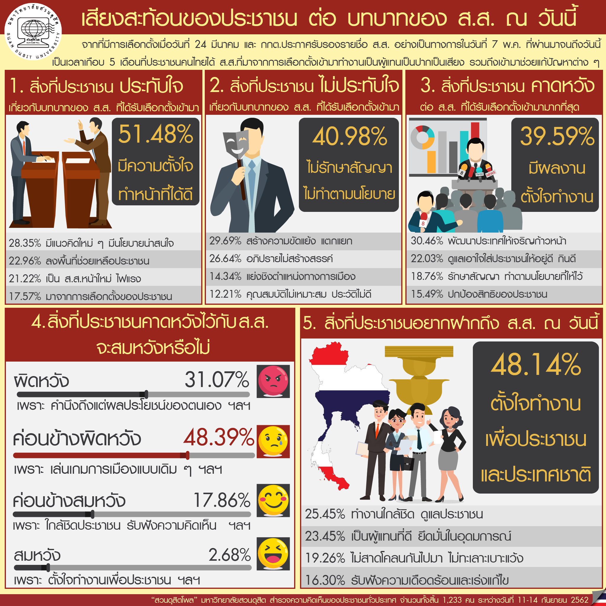 หลังการเลือกตั้งวันที่ 24 มีนาคม และการรับรองรายชื่อ ส.ส. อย่างเป็นทางการเมื่อวันที่ 7 พฤษภาคม 2562 ประชาชนมีความคาดหวังต่อบทบาทของผู้แทนที่มาจากการเลือกตั้งอย่างชัดเจน จากการสำรวจประชาชน 1,233 คน ระหว่างวันที่ 11–14 กันยายน 2562 พบว่า สิ่งที่ประชาชนประทับใจมากที่สุดคือ ความตั้งใจในการทำงานของ ส.ส. (51.48%) ความคิดใหม่ ๆ และการลงพื้นที่ดูแลประชาชน ขณะที่สิ่งที่ไม่ประทับใจคือการไม่รักษาสัญญา (40.98%) การทะเลาะเบาะแว้ง และการอภิปรายไม่สร้างสรรค์ ประชาชนคาดหวังให้ ส.ส. มีผลงานเป็นรูปธรรม (39.59%) พัฒนาชุมชน และปกป้องสิทธิของประชาชน อย่างไรก็ตาม มีเพียง 2.68% เท่านั้นที่รู้สึกสมหวังกับบทบาทของ ส.ส. ขณะที่เกือบครึ่งหนึ่งรู้สึก “ค่อนข้างผิดหวัง” จากพฤติกรรมทางการเมืองที่ยังคงวนเวียนกับผลประโยชน์ส่วนตน ข้อเสนอหลักจากประชาชนคือให้ ส.ส. มุ่งทำงานเพื่อประชาชนอย่างจริงจัง มีความซื่อสัตย์ และใกล้ชิดประชาชนมากขึ้น