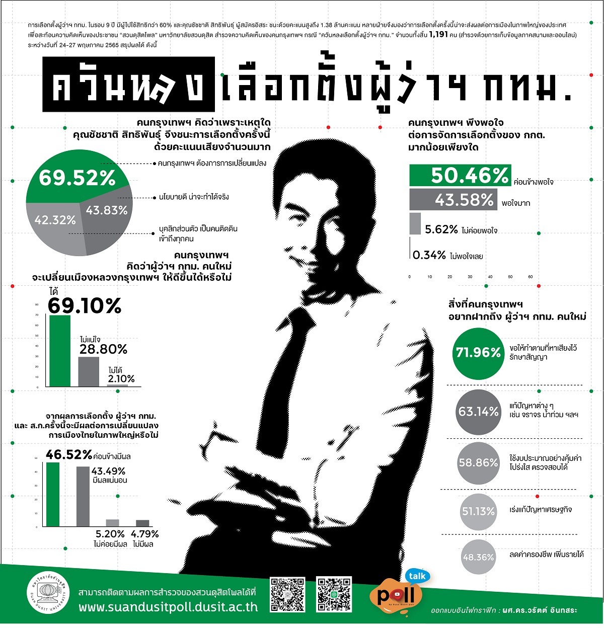 หลังการเลือกตั้งผู้ว่าราชการกรุงเทพมหานครในรอบ 9 ปี ซึ่งคุณชัชชาติ สิทธิพันธุ์ ได้รับชัยชนะอย่างถล่มทลายด้วยคะแนนกว่า 1.38 ล้านเสียง มีการสำรวจความคิดเห็นของประชาชนในเขตกรุงเทพฯ จำนวน 1,191 คน ระหว่างวันที่ 24–27 พฤษภาคม 2565 พบว่า เหตุผลหลักที่ชัชชาติชนะการเลือกตั้งคือประชาชนต้องการการเปลี่ยนแปลง (69.52%) เห็นว่านโยบายมีความเป็นไปได้จริง (43.83%) และมีบุคลิกที่เข้าถึงง่าย (42.32%) ประชาชนส่วนใหญ่มองว่า ผู้ว่าฯ คนใหม่จะสามารถเปลี่ยนแปลงกรุงเทพฯ ให้ดีขึ้น (69.10%) และผลการเลือกตั้งครั้งนี้มีอิทธิพลต่อทิศทางการเมืองระดับชาติ (ค่อนข้างมีผล 46.52%, มีผลแน่นอน 43.49%) ขณะเดียวกัน ประชาชนยังพึงพอใจต่อการจัดการเลือกตั้งของ กกต. และสิ่งที่ประชาชนคาดหวังมากที่สุดจากผู้ว่าฯ คนใหม่คือการรักษาสัญญา แก้ปัญหาเมือง และใช้งบประมาณโปร่งใส การเลือกตั้งครั้งนี้จึงสะท้อนจุดเปลี่ยนสำคัญของกระแสการเมืองไทยในอนาคต