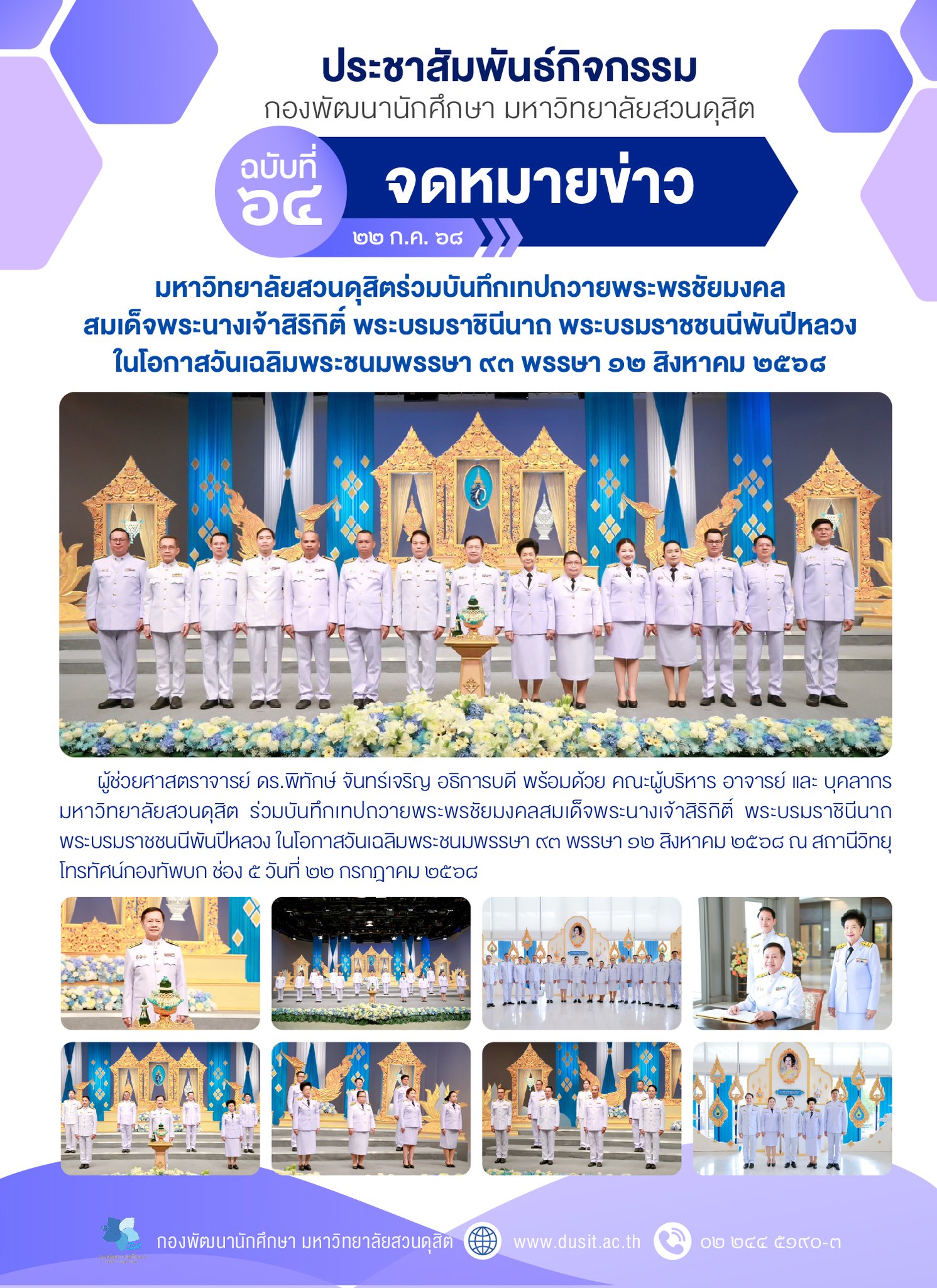 มหาวิทยาลัยสวนดุสิตร่วมบันทึกเทปถวายพระพรชัยมงคล สมเด็จพระนางเจ้าสิริกิติ์ พระบรมราชินีนาถ พระบรมราชชนนีพันปีหลวง ในโอกาสวันเฉลิมพระชนมพรรษา ๙๓ พรรษา ๑๒ สิงหาคม ๒๕๖๘