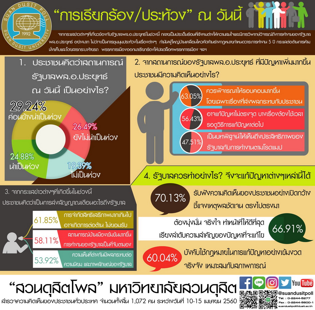 การสำรวจความคิดเห็นของประชาชนจำนวน 1,072 คน ระหว่างวันที่ 10-15 เมษายน 2560 เกี่ยวกับสถานการณ์การเรียกร้องประท้วงในรัฐบาลพล.อ.ประยุทธ์ พบว่า ประชาชนส่วนใหญ่มองว่าสถานการณ์ค่อนข้างน่าเป็นห่วง (29.24%) เนื่องจากมีการเคลื่อนไหวของกลุ่มต่างๆ และการใช้อำนาจตัดสินใจโดยไม่รับฟังเสียงจากรอบด้าน ประชาชนเห็นว่ารัฐบาลควรพิจารณาให้รอบคอบมากขึ้น (63.05%) และมองกระแสข่าวต่างๆ เป็นการส่งสัญญาณเตือนเรื่องการจำกัดสิทธิเสรีภาพมากเกินไป (61.85%) และสถานการณ์บ้านเมืองที่เข้มข้นมากขึ้น (58.11%) สำหรับการแก้ปัญหา ประชาชนต้องการให้รัฐบาลรับฟังความคิดเห็นอย่างเปิดกว้างและชี้แจงเหตุผลชัดเจน (70.13%) รวมถึงต้องมุ่งมั่นทำหน้าที่ให้ดีที่สุด (66.91%)