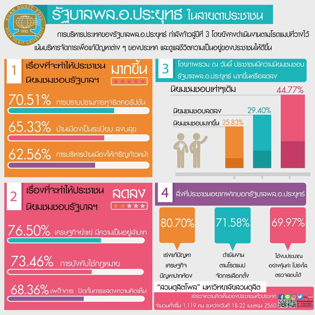 การศึกษาครั้งนี้ส่ารวจความคิดเห็นของประชาชนทั่วประเทศจำนวน 1,119 คน ระหว่างวันที่ 18-22 เมษายน 2560 เกี่ยวกับการรับรู้ของประชาชนต่อรัฐบาลพล.อ.ประยุทธ์ในปีที่ 3 ของการบริหารประเทศ ผลการส่ารวจพบว่า ปัจจัยที่จะทำให้ประชาชนนิยมชมชอบรัฐบาลมากขึ้น ได้แก่ การปราบปรามการทุจริตคอร์รัปชั่น (70.51%) บ้านเมืองเป็นระเบียบสงบสุข (65.33%) และการบริหารบ้านเมืองให้เจริญก้าวหน้า (62.56%) ในขณะที่ปัจจัยที่จะทำให้ความนิยมลดลง คือ เศรษฐกิจย่ำแย่ (76.50%) การบังคับใช้กฎหมายเข้มงวด (73.46%) และการเผด็จการปิดกั้นการแสดงความคิดเห็น (68.36%) สำหรับระดับความนิยมโดยรวม ประชาชนส่วนใหญ่มีความนิยมเท่าเดิม (44.77%) ลดลง (29.40%) และเพิ่มขึ้น (25.83%) ตามลำดับ ประชาชนต้องการให้รัฐบาลเร่งแก้ปัญหาเศรษฐกิจ (80.70%) ดำเนินงานตามโรดแมป (71.58%) และใช้งบประมาณอย่างโปร่งใส (69.97%)