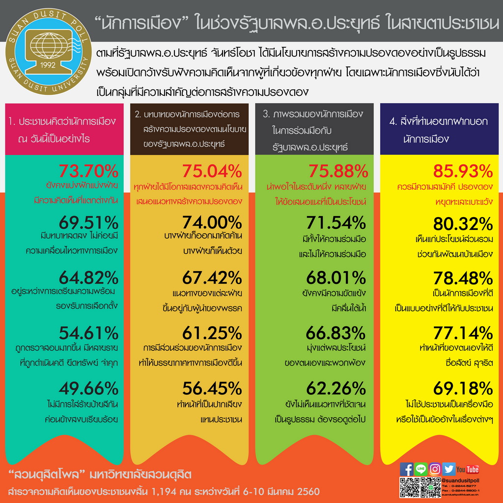 เพื่อสะท้อนมุมมองของประชาชนต่อบทบาทของนักการเมืองในช่วงรัฐบาล พล.อ.ประยุทธ์ จันทร์โอชา “สวนดุสิตโพล” ได้สำรวจความคิดเห็นจากประชาชนทั่วประเทศจำนวน 1,194 คน ระหว่างวันที่ 6–10 มีนาคม 2560 โดยมุ่งเน้นด้านภาพลักษณ์ บทบาทต่อความปรองดอง และการทำงานร่วมกับรัฐบาล ผลสำรวจพบว่า ประชาชนมองว่านักการเมืองยังคงมีลักษณะ “แบ่งฝักแบ่งฝ่าย” (73.70%) และ “มีบทบาทลดลง” (69.51%) ในขณะที่บางส่วนกำลัง “เตรียมความพร้อมเพื่อการเลือกตั้ง” (64.82%) ด้านการสร้างความปรองดอง ประชาชนเห็นว่าทุกฝ่ายมีโอกาสเสนอแนวทางร่วมกัน (75.04%) แม้จะมีทั้งฝ่ายที่เห็นด้วยและคัดค้าน (74.00%) ภาพรวมการร่วมมือกับรัฐบาลถือว่า “น่าพอใจในระดับหนึ่ง” (75.88%) โดยประชาชนอยากให้นักการเมือง “สามัคคี หยุดทะเลาะ” (85.93%) “ทำงานเพื่อส่วนรวม” และ “เป็นแบบอย่างที่ดี” แก่ประชาชน ซึ่งสะท้อนความคาดหวังอย่างสูงต่อการเมืองที่สร้างสรรค์และเสริมสร้างความมั่นคงของชาติ