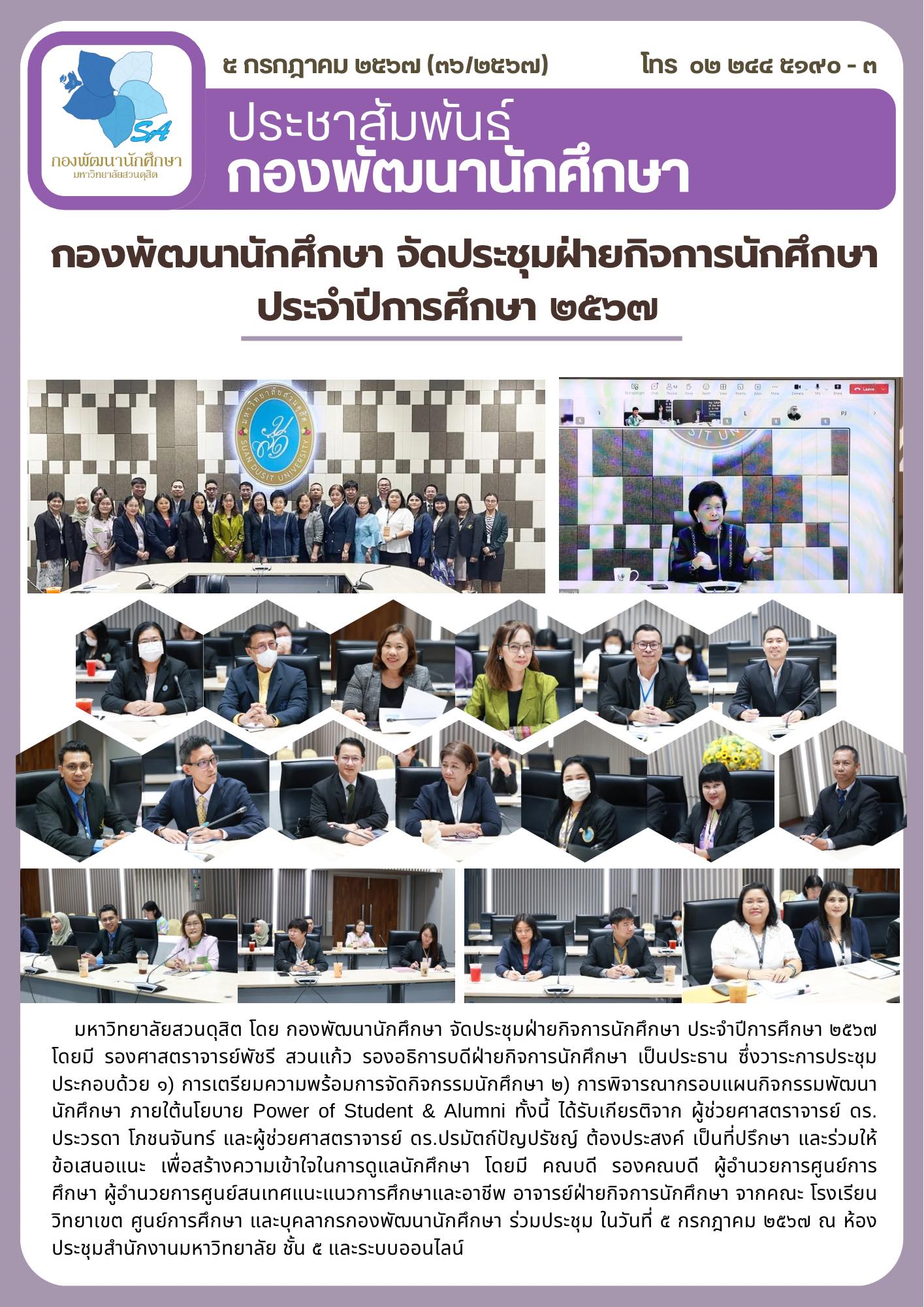 มหาวิทยาลัยสวนดุสิต โดย กองพัฒนานักศึกษา จัดประชุมฝ่ายกิจการนักศึกษา ประจำปีการศึกษา ๒๕๖๗ โดยมี รองศาสตราจารย์พัชรี สวนแก้ว รองอธิการบดีฝ่ายกิจการนักศึกษา เป็นประธาน ซึ่งวาระการประชุมประกอบด้วย ๑) การเตรียมความพร้อมการจัดกิจกรรมนักศึกษา ๒) การพิจารณากรอบแผนกิจกรรมพัฒนานักศึกษา ภายใต้นโยบาย Power of Student & Alumni ทั้งนี้ ได้รับเกียรติจาก ผู้ช่วยศาสตราจารย์ ดร. ประวรดา โภชนจันทร์ และผู้ช่วยศาสตราจารย์ ดร.ปรมัตถ์ปัญปรัชญ์ ต้องประสงค์ เป็นที่ปรึกษา และร่วมให้ข้อเสนอแนะ เพื่อสร้างความเข้าใจในการดูแลนักศึกษา โดยมี คณบดี รองคณบดี ผู้อำนวยการศูนย์การศึกษา ผู้อำนวยการศูนย์สนเทศแนะแนวการศึกษาและอาชีพ อาจารย์ฝ่ายกิจการนักศึกษา จากคณะ โรงเรียน วิทยาเขต ศูนย์การศึกษา และบุคลากรกองพัฒนานักศึกษา ร่วมประชุม ในวันที่ ๕ กรกฎาคม ๒๕๖๗ ณ ห้องประชุมสำนักงานมหาวิทยาลัย ชั้น ๕ และระบบออนไลน์