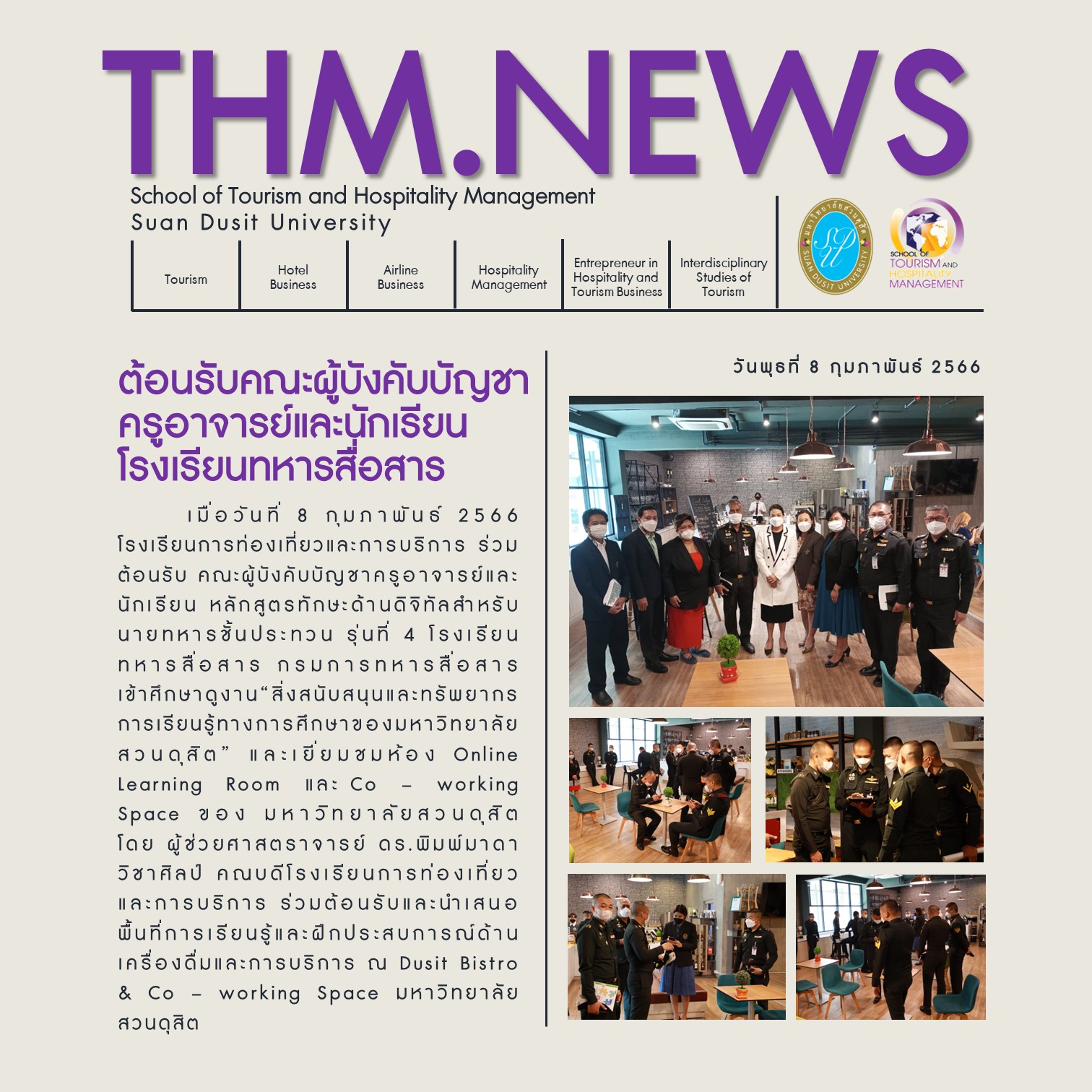 เมื่อวันที่ 8 กุมภาพันธ์ 2566 โรงเรียนการท่องเที่ยวและการบริการ ร่วมต้อนรับ คณะผู้บังคับบัญชาครูอาจารย์และนักเรียน หลักสูตรทักษะด้านดิจิทัลสำหรับนายทหารชั้นประทวน รุ่นที่ 4 โรงเรียนทหารสื่อสาร กรมการทหารสื่อสารเข้าศึกษาดูงาน “สิ่งสนับสนุนและทรัพยากรการเรียนรู้ทางการศึกษาของมหาวิทยาลัยสวนดุสิต” และเยี่ยมชมห้อง Online Learning Room และ Co – working Space ของ มหาวิทยาลัยสวนดุสิต โดย ผู้ช่วยศาสตราจารย์ ดร.พิมพ์มาดา วิชาศิลป์ คณบดีโรงเรียนการท่องเที่ยวและการบริการ ร่วมต้อนรับและนำเสนอพื้นที่การเรียนรู้และฝึกประสบการณ์ด้านเครื่องดื่มและการบริการ ณ Dusit Bistro & Co – working Space มหาวิทยาลัยสวนดุสิต