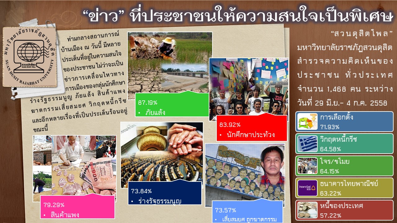 จากสถานการณ์บ้านเมืองในช่วงเดือนมิถุนายนถึงกรกฎาคม พ.ศ. 2558 “สวนดุสิตโพล” มหาวิทยาลัยราชภัฏสวนดุสิต ได้สำรวจความคิดเห็นของประชาชนทั่วประเทศจำนวน 1,468 คน เกี่ยวกับข่าวที่ได้รับความสนใจเป็นพิเศษ พบว่า 10 อันดับข่าวที่ได้รับความสนใจสูงสุด ได้แก่ ภัยแล้ง นักศึกษาประท้วง สินค้าแพง ร่างรัฐธรรมนูญ คดีฆาตกรรมเสี่ยสมยศ การเลือกตั้ง วิกฤตหนี้กรีซ ปัญหาโจรกรรม ธนาคารไทยพาณิชย์ และปัญหาหนี้ของประเทศ โดยภัยแล้งได้รับความสนใจมากที่สุด เนื่องจากมีผลกระทบในวงกว้างต่อเศรษฐกิจและสิ่งแวดล้อม ขณะที่ข่าวนักศึกษาประท้วงและร่างรัฐธรรมนูญสะท้อนถึงความตื่นตัวทางการเมืองของประชาชน การสำรวจนี้สะท้อนให้เห็นถึงความต้องการข้อมูลที่ตรงกับความสนใจของสาธารณชน อันจะเป็นแนวทางสำคัญในการนำเสนอข่าวของสื่อมวลชนให้ตรงประเด็นและตอบสนองความคาดหวังของประชาชนได้อย่างแท้จริง