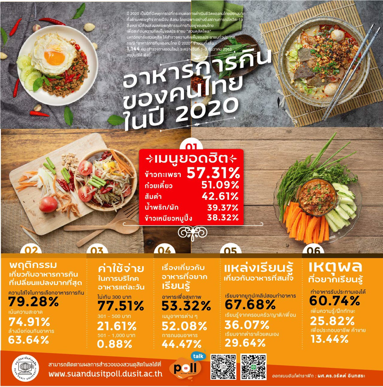 สวนดุสิตโพล มหาวิทยาลัยสวนดุสิต ได้ทำการสำรวจความคิดเห็นของประชาชนจำนวน 1,144 คน ระหว่างวันที่ 1–3 ธันวาคม 2563 เพื่อศึกษาพฤติกรรมด้านอาหารการกินของคนไทยในปี 2020 ท่ามกลางผลกระทบจากโควิด-19 พบว่า พฤติกรรมที่เปลี่ยนแปลงเด่นชัดคือความใส่ใจในการเลือกอาหาร (79.28%) ความสะอาด และคุณค่าทางโภชนาการ เมนูยอดนิยม ได้แก่ ข้าวกะเพรา ก๋วยเตี๋ยว และส้มตำ โดยค่าใช้จ่ายต่อวันส่วนใหญ่ไม่เกิน 300 บาท ประชาชนสนใจเรียนรู้อาหารเพื่อสุขภาพผ่าน YouTube หรือคลิปสอนทำอาหาร เพื่อประกอบอาหารเอง (60.74%) สะท้อนความตื่นตัวต่อสุขภาพและการประหยัดค่าใช้จ่ายในสถานการณ์วิกฤต นอกจากนี้ การทำอาหารเองยังกลายเป็นกิจกรรมที่เพิ่มคุณค่าให้ชีวิตและจิตใจ ท่ามกลางความไม่แน่นอนทั้งด้านเศรษฐกิจ สังคม และการเมืองในปีนั้น