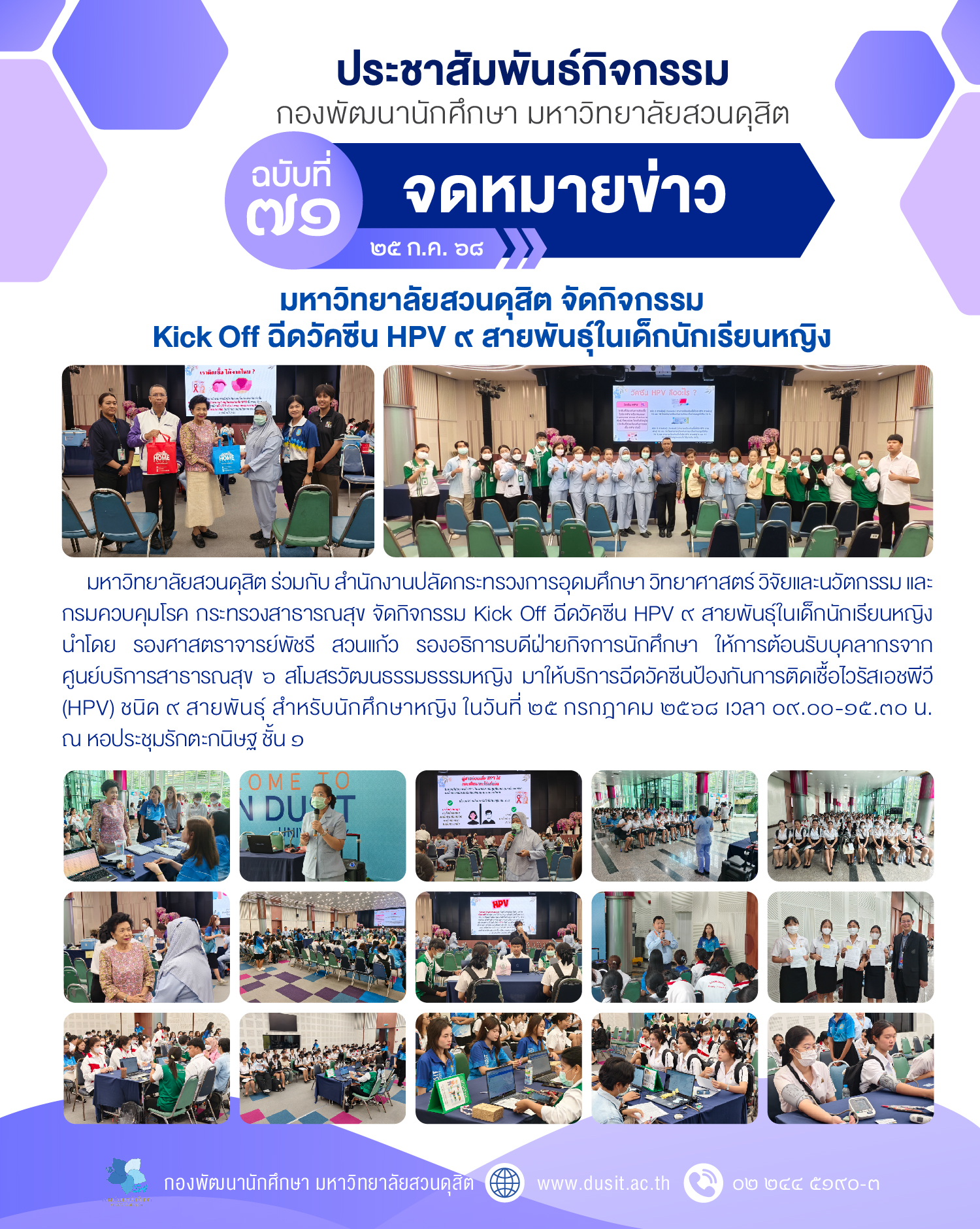 มหาวิทยาลัยสวนดุสิต ร่วมกับ สำนักงานปลัดกระทรวงการอุดมศึกษา วิทยาศาสตร์ วิจัยและนวัตกรรม และ กรมควบคุมโรค กระทรวงสาธารณสุข จัดกิจกรรม Kick Off ฉีดวัคซีน HPV ๙ สายพันธุ์ในเด็กนักเรียนหญิง นำโดย รองศาสตราจารย์พัชรี สวนแก้ว รองอธิการบดีฝ่ายกิจการนักศึกษา ให้การต้อนรับบุคลากรจาก ศูนย์บริการสาธารณสุข ๖ สโมสรวัฒนธรรมธรรมหญิง มาให้บริการฉีดวัคซีนป้องกันการติดเชื้อไวรัสเอชพีวี (HPV) ชนิด ๙ สายพันธุ์ สำหรับนักศึกษาหญิง ในวันที่ ๒๕ กรกฎาคม ๒๕๖๘ เวลา ๐๙.๐๐-๑๕.๓๐ น. ณ หอประชุมรักตะกนิษฐ ชั้น ๑