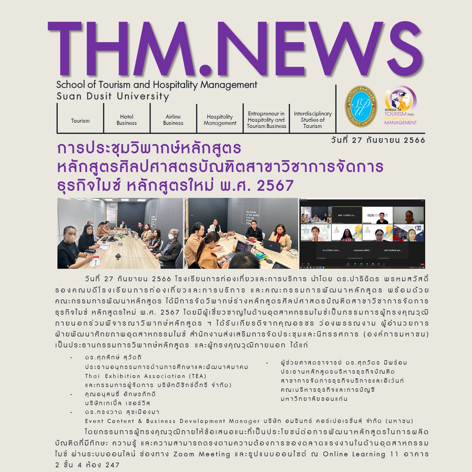 วันที่ 27 กันยายน 2566 โรงเรียนการท่องเที่ยวและการบริการ นำโดย ดร.ปาริฉัตร พรหมสวัสดิ์ รองคณบดีโรงเรียนการท่องเที่ยวและการบริการ และคณะกรรมการพัฒนาหลักสูตร พร้อมด้วยคณะกรรมการพัฒนาหลักสูตร ได้มีการจัดวิพากษ์ร่างหลักสูตรศิลปศาสตรบัณฑิตสาขาวิชาการจัดการธุรกิจไมซ์ หลักสูตรใหม่ พ.ศ. 2567 โดยมีผู้เชี่ยวชาญในด้านอุตสาหกรรมไมซ์เป็นกรรมการผู้ทรงคุณวุฒิภายนอกร่วมพิจารณาวิพากษ์หลักสูตร ฯ ได้รับเกียรติจากคุณอรชร ว่องพรรณงาม ผู้อำนวยการฝ่ายพัฒนาศักยภาพอุตสาหกรรมไมซ์ สำนักงานส่งเสริมการจัดประชุมและนิทรรศการ (องค์การมหาชน) เป็นประธานกรรมการวิพากษ์หลักสูตร และผู้ทรงคุณวุฒิภายนอก ได้แก่ - ดร.ศุภลักษ์ สุวัตถิ