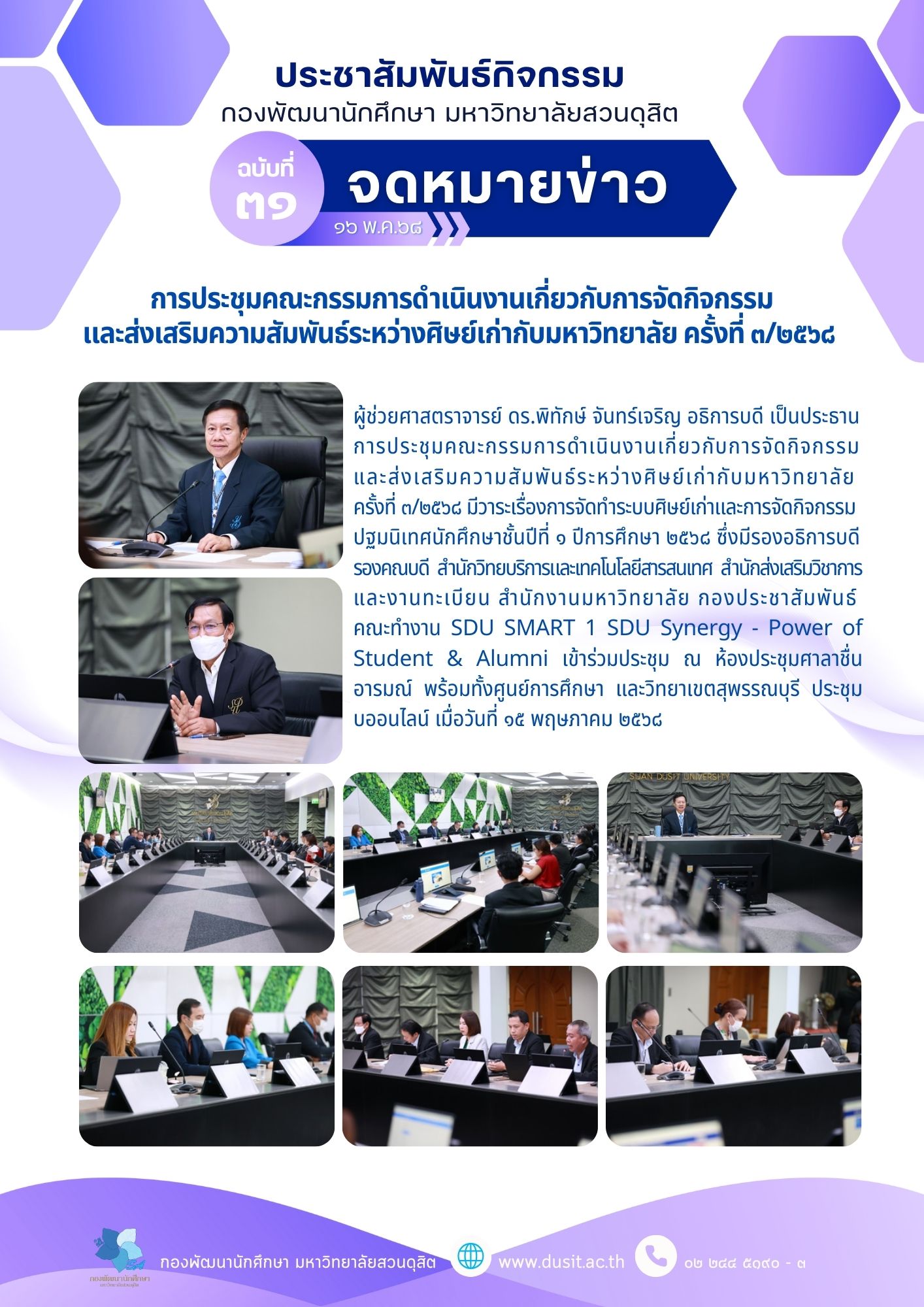 ผู้ช่วยศาสตราจารย์ ดร.พิทักษ์ จันทร์เจริญ อธิการบดี เป็นประธานการประชุมคณะกรรมการดำเนินงานเกี่ยวกับการจัดกิจกรรมและส่งเสริมความสัมพันธ์ระหว่างศิษย์เก่ากับมหาวิทยาลัย ครั้งที่ ๓/๒๕๖๘ มีวาระเรื่องการจัดทำระบบศิษย์เก่าและการจัดกิจกรรมปฐมนิเทศนักศึกษาชั้นปีที่ ๑ ปีการศึกษา ๒๕๖๘ ซึ่งมีรองอธิการบดีรองคณบดี สำนักวิทยบริการและเทคโนโลยีสารสนเทศ สำนักส่งเสริมวิชาการและงานทะเบียน สำนักงานมหาวิทยาลัย กองประชาสัมพันธ์ คณะทำงาน SDU SMART 1 SDU Synergy - Power of Student & Alumni เข้าร่วมประชุม ณ ห้องประชุมศาลาชื่นอารมณ์ พร้อมทั้งศูนย์การศึกษา และวิทยาเขตสุพรรณบุรี ประชุมบออนไลน์ เมื่อวันที่ ๑๕ พฤษภาคม ๒๕๖๘