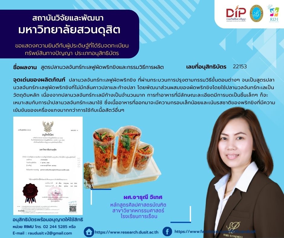 จุดเด่นของผลิตภัณฑ์ปลานวลจันทร์ทะเลฟูผัดพริกขิง ที่ผ่านกระบวนการปรุงตามกรรมวิธีขั้นตอนต่างๆ จนเป็นสูตรปลานวลจันทร์ทะเลฟูผัดพริกขิงที่ไม่มีกลิ่นคาวปลาและก้างปลา โดยพัฒนาส่วนผสมของผัดพริกขิงโดยใช้ปลานวลจันทร์ทะเลเป็น วัตถุดิบหลัก เนื่องจากปลานวลจันทร์ทะเลมีก้างเป็นจำนวนมาก การทำอาหารที่มีลักษณะละเอียดมีการบดเป็นชิ้นเล็กๆ ก็จะ เหมาะสมกับการนำปลานวลจันทร์ทะเลมาใช้ ซึ่งเนื้ออาหารที่ออกมาจะมีความกรอบเล็กน้อยและเน้นรสชาติของพริกขิงที่มีความ เข้มข้นของเครื่องแกงมากกว่าการใช้กับเนื้อสัตว์อื่นๆ