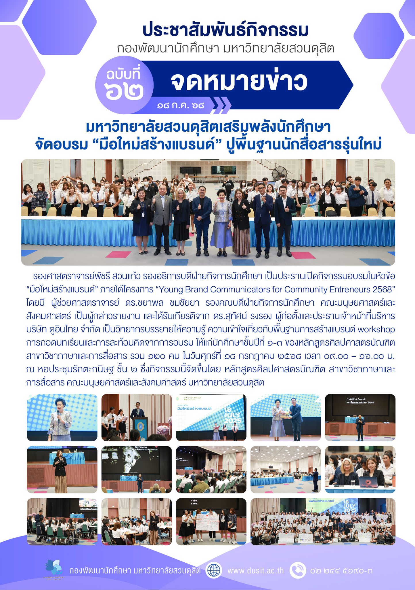 รองศาสตราจารย์พัชรี สวนแก้ว รองอธิการบดีฝ่ายกิจการนักศึกษา เป็นประธานเปิดกิจกรรมอบรมในหัวข้อ “มือใหม่สร้างแบรนด์” ภายใต้โครงการ “Young Brand Communicators for Community Entreneurs 2568” โดยมี ผู้ช่วยศาสตราจารย์ ดร.ชยาพล ชมชัยยา รองคณบดีฝ่ายกิจการนักศึกษา คณะมนุษยศาสตร์และสังคมศาสตร์ เป็นผู้กล่าวรายงาน และได้รับเกียรติจาก ดร.สุทัศน์ รงรอง ผู้ก่อตั้งและประธานเจ้าหน้าที่บริหาร บริษัท ดูอินไทย จำกัด เป็นวิทยากรบรรยายให้ความรู้ ความเข้าใจเกี่ยวกับพื้นฐานการสร้างแบรนด์ workshop การถอดบทเรียนและการสะท้อนคิดจากการอบรม ให้แก่นักศึกษาชั้นปีที่ ๑-๓ ของหลักสูตรศิลปศาสตรบัณฑิต สาขาวิชาภาษาและการสื่อสาร รวม ๑๖๐ คน ในวันศุกร์ที่ ๑๘ กรกฎาคม ๒๕๖๘ เวลา ๐๙.๐๐ – ๑๖.๐๐ น. ณ หอประชุมรักตะกนิษฐ ชั้น ๒ ซึ่งกิจกรรมนี้จัดขึ้นโดย หลักสูตรศิลปศาสตรบัณฑิต สาขาวิชาภาษาและการสื่อสาร คณะมนุษยศาสตร์และสังคมศาสตร์ มหาวิทยาลัยสวนดุสิต