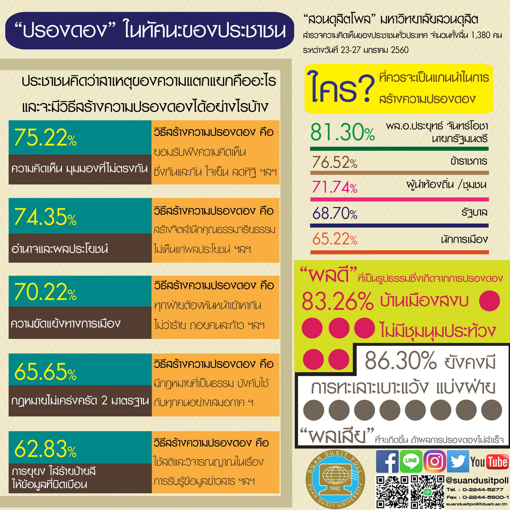 จากสถานการณ์ความขัดแย้งทางการเมืองและสังคมของไทย “สวนดุสิตโพล” ได้สำรวจความคิดเห็นประชาชน 1,380 คน พบว่าสาเหตุหลักของความแตกแยกคือความคิดเห็นไม่ตรงกัน (75.22%) ผลประโยชน์ทางการเมือง และกฎหมายไม่เป็นธรรม ประชาชนเสนอแนวทางสร้างความปรองดองด้วยการรับฟัง ลดอคติ และใช้กฎหมายอย่างเสมอภาค โดยเห็นว่าผู้นำควรเป็น พล.อ.ประยุทธ์ จันทร์โอชา (81.30%) ผลที่คาดหวังคือความสงบของประเทศ (83.26%) ขณะที่ความล้มเหลวอาจนำไปสู่ความขัดแย้งและปัญหาเศรษฐกิจ–สังคม