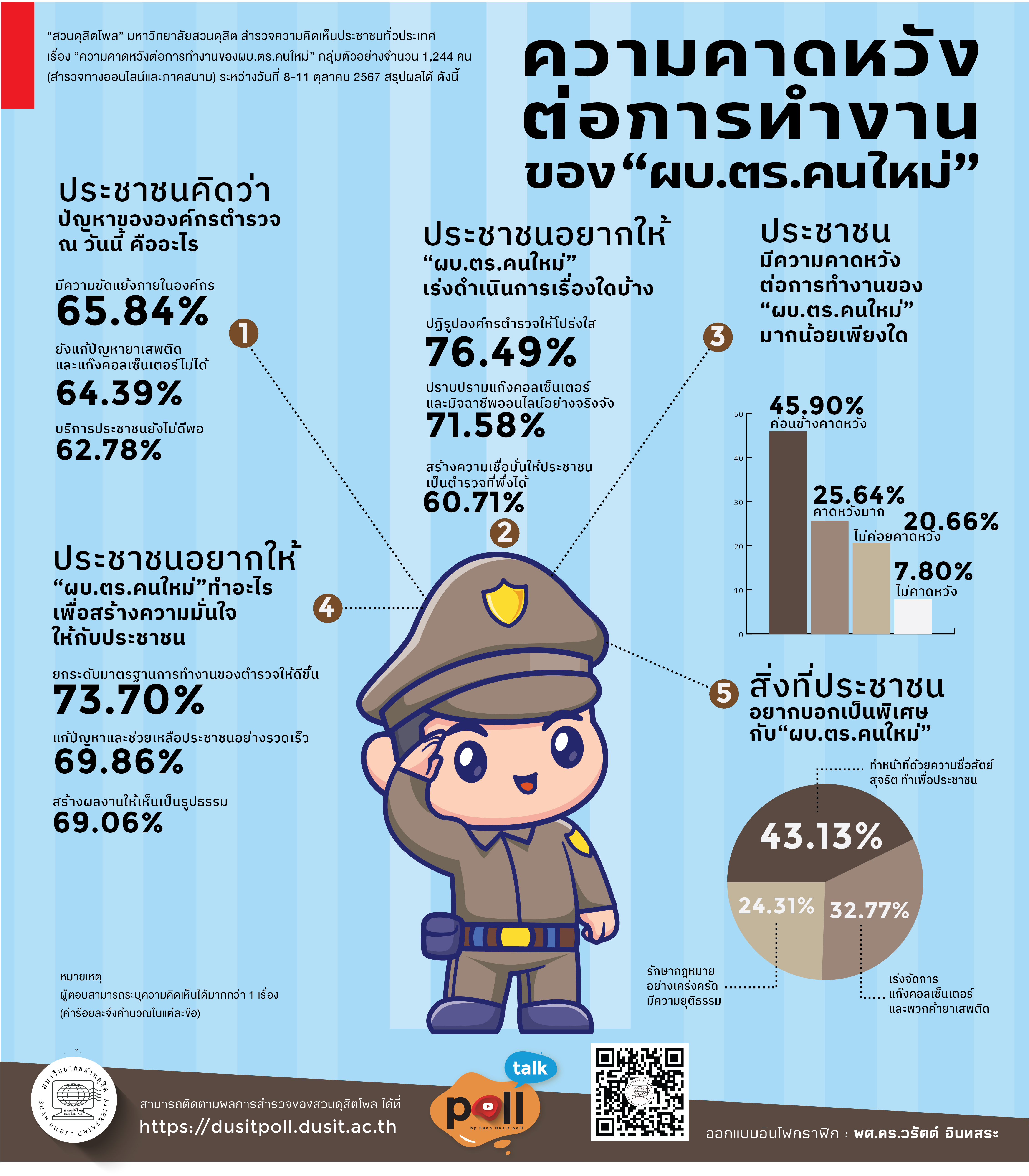 สวนดุสิตโพล มหาวิทยาลัยสวนดุสิต สำรวจความคิดเห็นประชาชนทั่วประเทศ เรื่อง “ความคาดหวังต่อการทำงานของ ผบ.ตร.คนใหม่” กลุ่มตัวอย่างจำนวน 1,244 คน (สำรวจทางออนไลน์และภาคสนาม) ระหว่างวันที่ 8-11 ตุลาคม 2567 พบว่า กลุ่มตัวอย่างมองว่าปัญหาขององค์กรตำรวจ ณ วันนี้ คือ การมีความขัดแย้งภายในองค์กร ร้อยละ 65.84 สิ่งที่อยากให้ผบ.ตร.คนใหม่ เร่งดำเนินการ คือ การปฏิรูปองค์กรตำรวจให้โปร่งใส ร้อยละ 76.49 โดยรวมค่อนข้างคาดหวังกับ ผบ.ตร. คนใหม่ ร้อยละ 45.90 สิ่งที่ช่วยสร้างความมั่นใจให้กับประชาชนมากขึ้น คือ ต้องยกระดับมาตรฐานการทำงานของตำรวจให้ดีขึ้น ร้อยละ 73.70 สุดท้ายสิ่งที่อยากบอกเป็นพิเศษกับ ผบ.ตร.คนใหม่ คือ ทำหน้าที่ด้วยความซื่อสัตย์ สุจริต ทำเพื่อประชาชน ร้อยละ 43.13