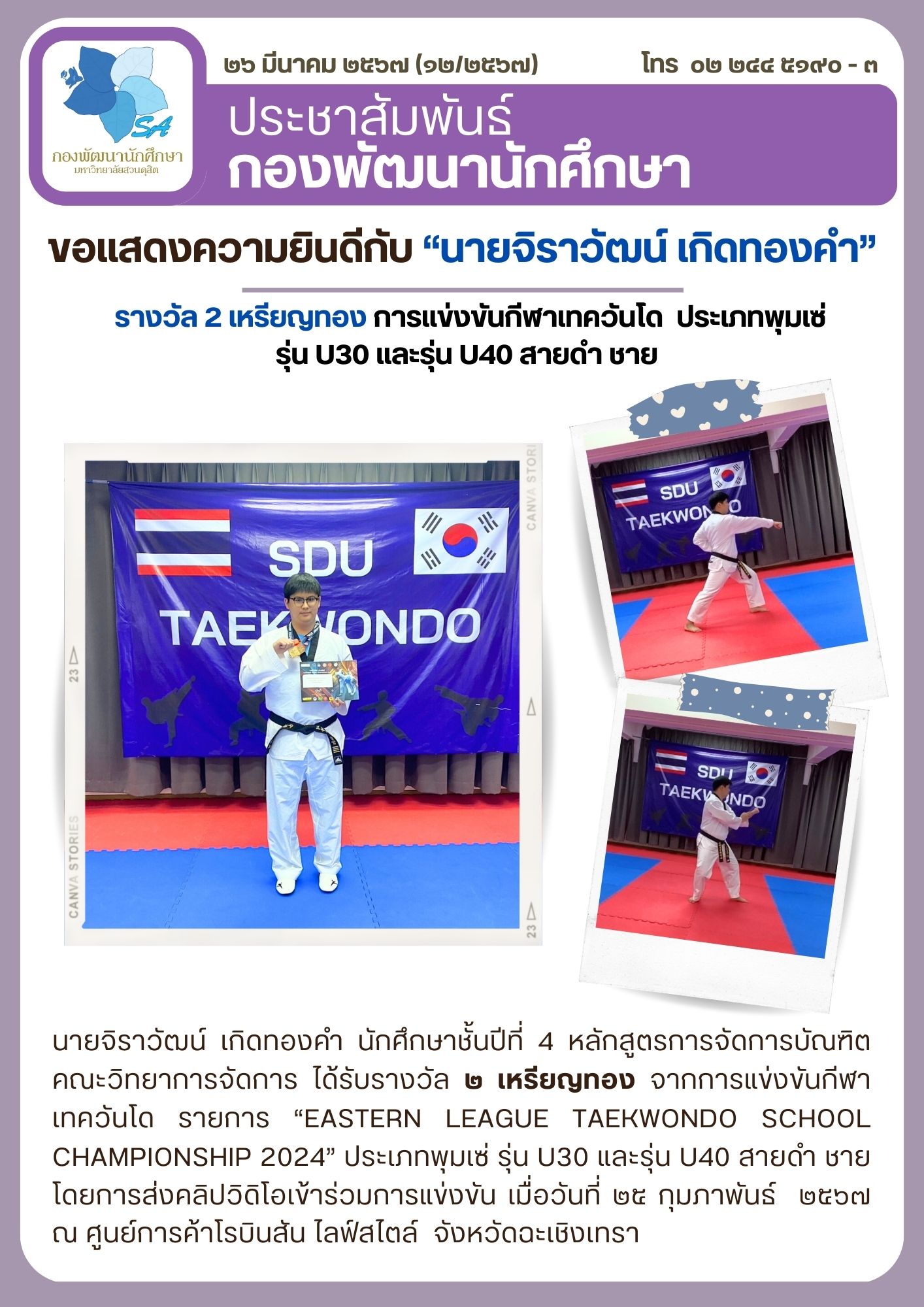 นายจิราวัฒน์ เกิดทองคำ นักศึกษาชั้นปีที่ ๔ หลักสูตรการจัดการบัณฑิต คณะวิทยาการจัดการ ได้รับรางวัล ๒ เหรียญทอง จากการแข่งขันกีฬา เทควันโด รายการ “EASTERN LEAGUE TAEKWONDO SCHOOL CHAMPIONSHIP 2024” ประเภทพุมเซ่ รุ่น U30 และรุ่น U40 สายดำ ชาย โดยการส่งคลิปวิดิโอเข้าร่วมการแข่งขัน เมื่อวันที่ ๒๕ กุมภาพันธ์ ๒๕๖๗ ณ ศูนย์การค้าโรบินสัน ไลฟ์สไตล์ จังหวัดฉะเชิงเทรา