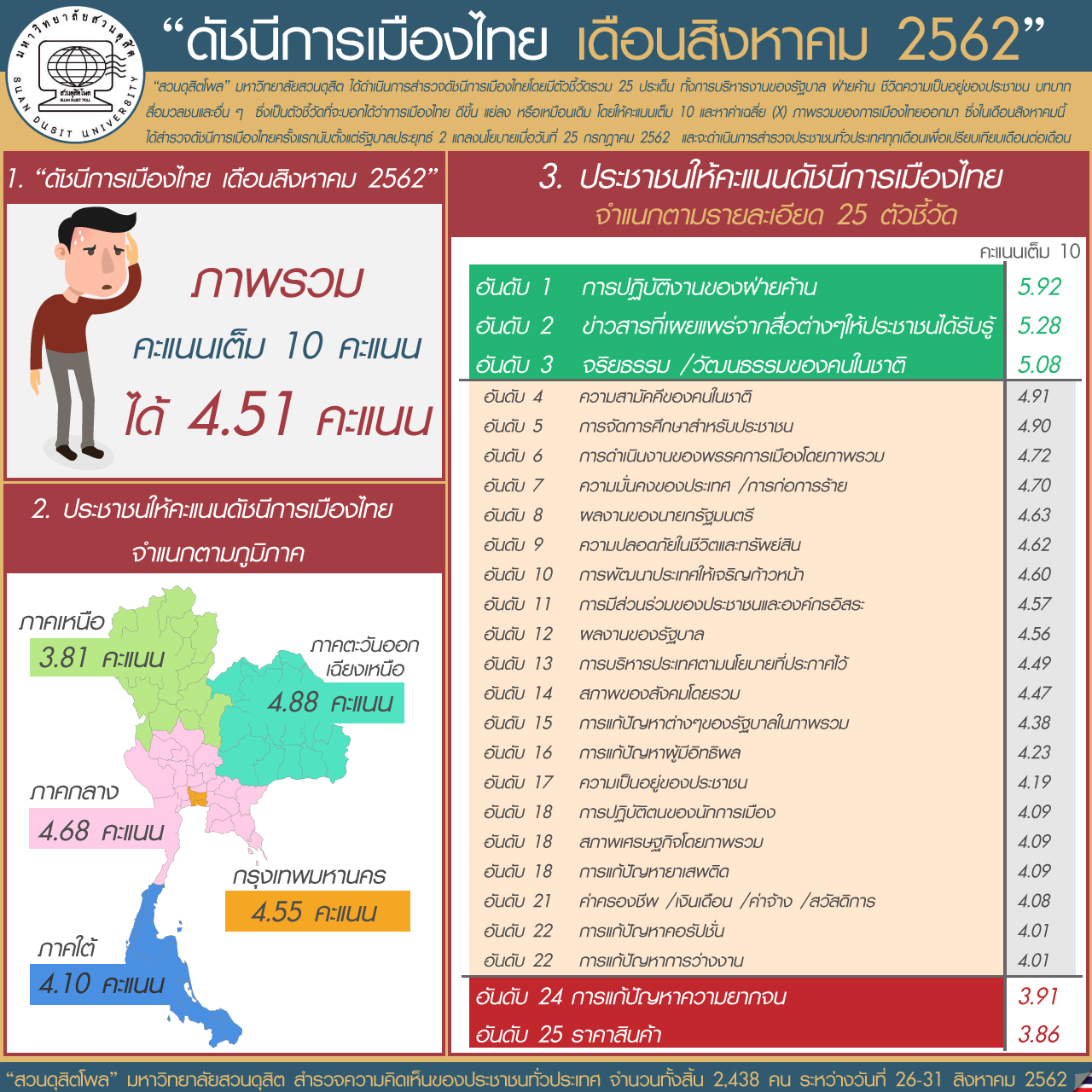 ในเดือนสิงหาคม 2562 มีการสำรวจ “ดัชนีการเมืองไทย” เป็นครั้งแรกนับตั้งแต่รัฐบาลประยุทธ์ 2 แถลงนโยบายต่อรัฐสภา โดยเก็บข้อมูลจากประชาชนทั่วประเทศจำนวน 2,438 คน ระหว่างวันที่ 26–31 สิงหาคม 2562 ด้วยตัวชี้วัด 25 ประเด็น โดยภาพรวมประชาชนให้คะแนนเฉลี่ย 4.51 จากคะแนนเต็ม 10 คะแนน ภาคที่ให้คะแนนสูงสุดคือภาคตะวันออกเฉียงเหนือ (4.88) ส่วนภาคเหนือให้คะแนนต่ำที่สุด (3.81) ประเด็นที่ได้คะแนนสูงสุด ได้แก่ การปฏิบัติงานของฝ่ายค้าน (5.92) รองลงมาคือข่าวสารจากสื่อ (5.28) และจริยธรรมของคนในชาติ (5.08) ส่วนประเด็นที่ได้คะแนนต่ำที่สุดคือ ราคาสินค้า (3.86) และการแก้ปัญหาความยากจน (3.91) สะท้อนว่าประชาชนยังไม่พึงพอใจต่อการบริหารจัดการด้านเศรษฐกิจและสังคมในระดับนโยบาย แม้จะเริ่มเห็นบทบาทของฝ่ายค้านและภาคประชาสังคมในการตรวจสอบและเสนอแนะแนวทางการพัฒนาประเทศ